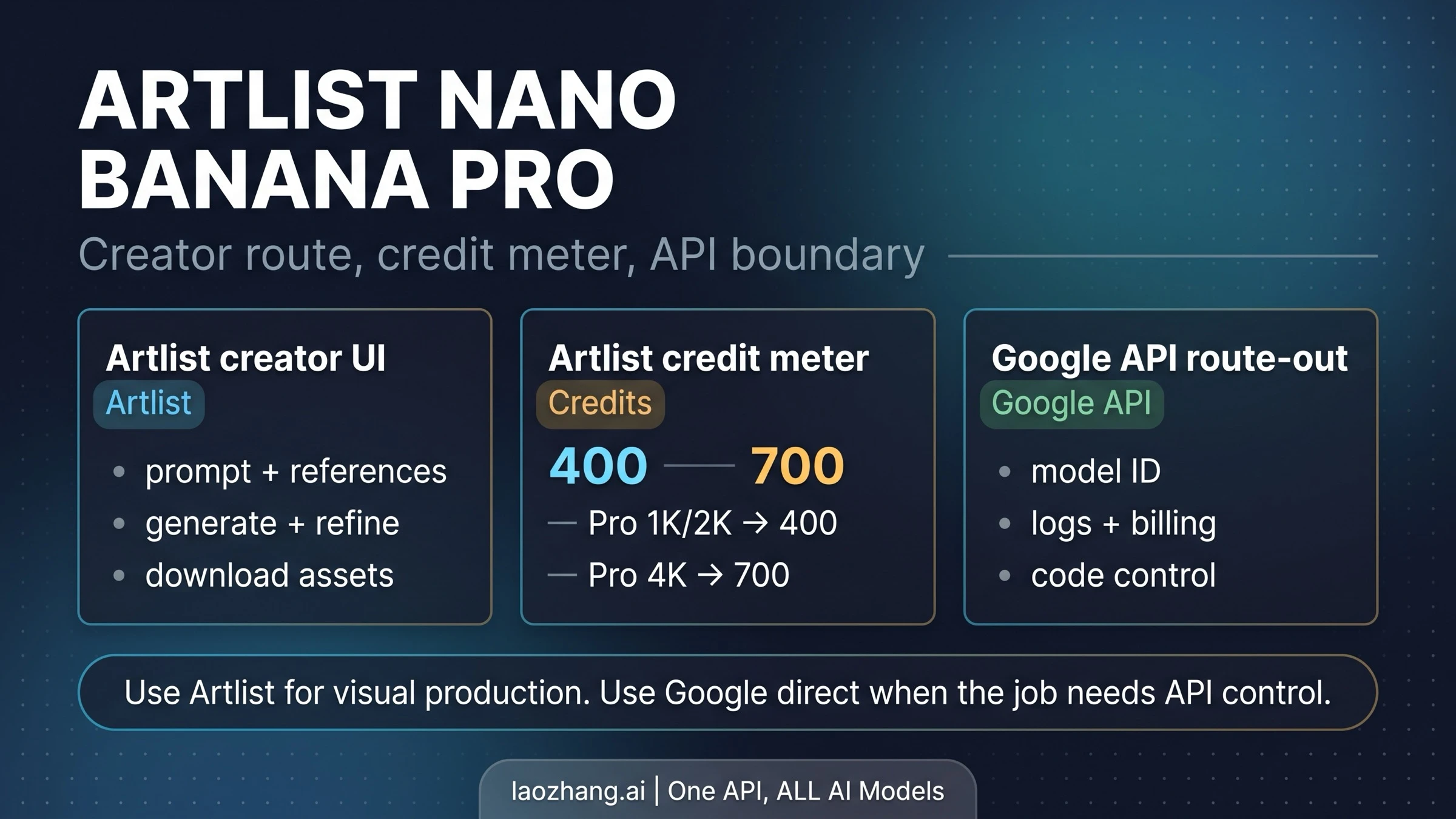 That separation changes the decision from a broad model question into a route and credit question. A generic model explainer can tell you that Pro is strong at text, layouts, 4K output, and high-fidelity imagery. The Artlist decision is narrower and more practical: is Artlist the right place to spend credits for this image, or should you use a cheaper Artlist model or Google's direct developer route?