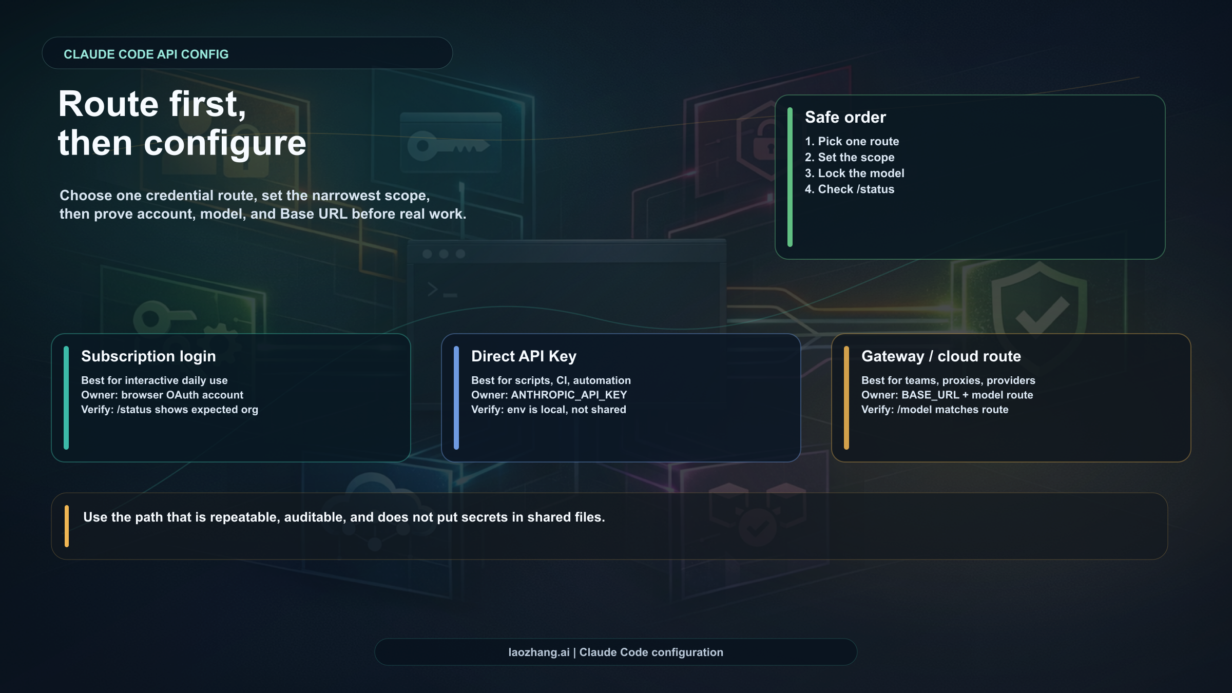 Claude Code API configuration starts with route choice, not with pasting a key. Before you set ANTHROPIC_API_KEY, edit settings.json, or point Claude Code at a gateway, decide which route should own this session: subscription login, direct Anthropic API key, bearer-token gateway, dynamic helper, Bedrock, Vertex, or Foundry.