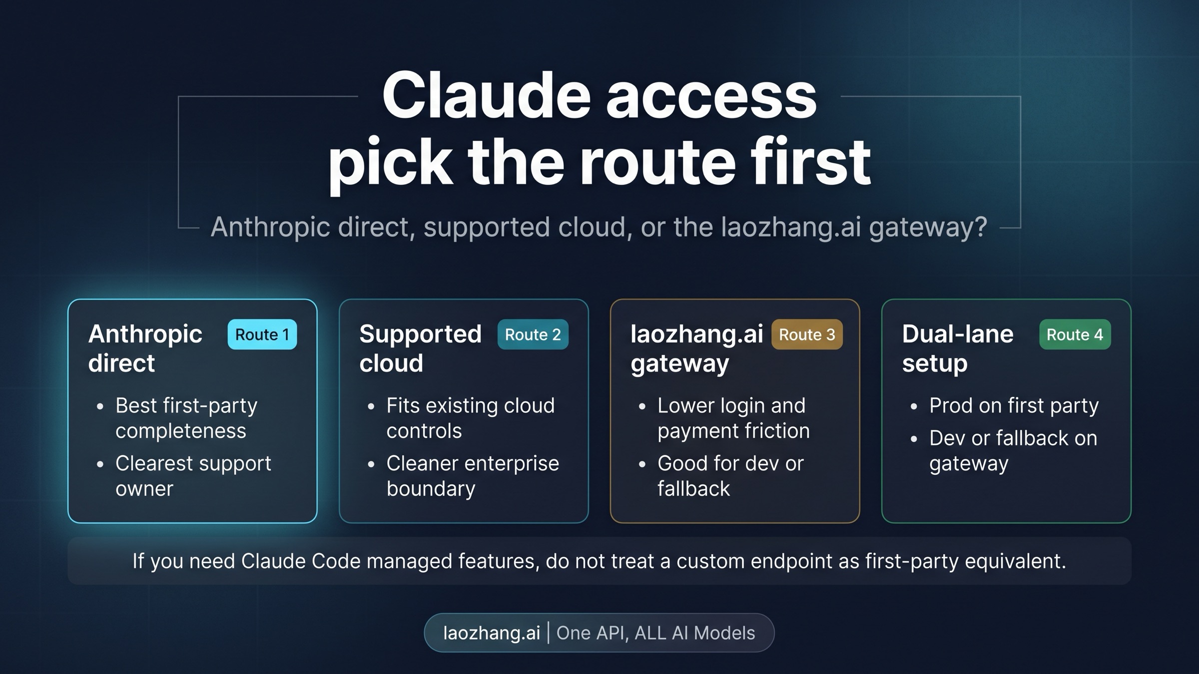 If first-party feature completeness, official support boundaries, and Claude Code managed capabilities matter most, Anthropic direct or a supported cloud should stay your main path. A gateway becomes more attractive only when lower login and payment friction, faster setup, and a practical backup path matter more.
