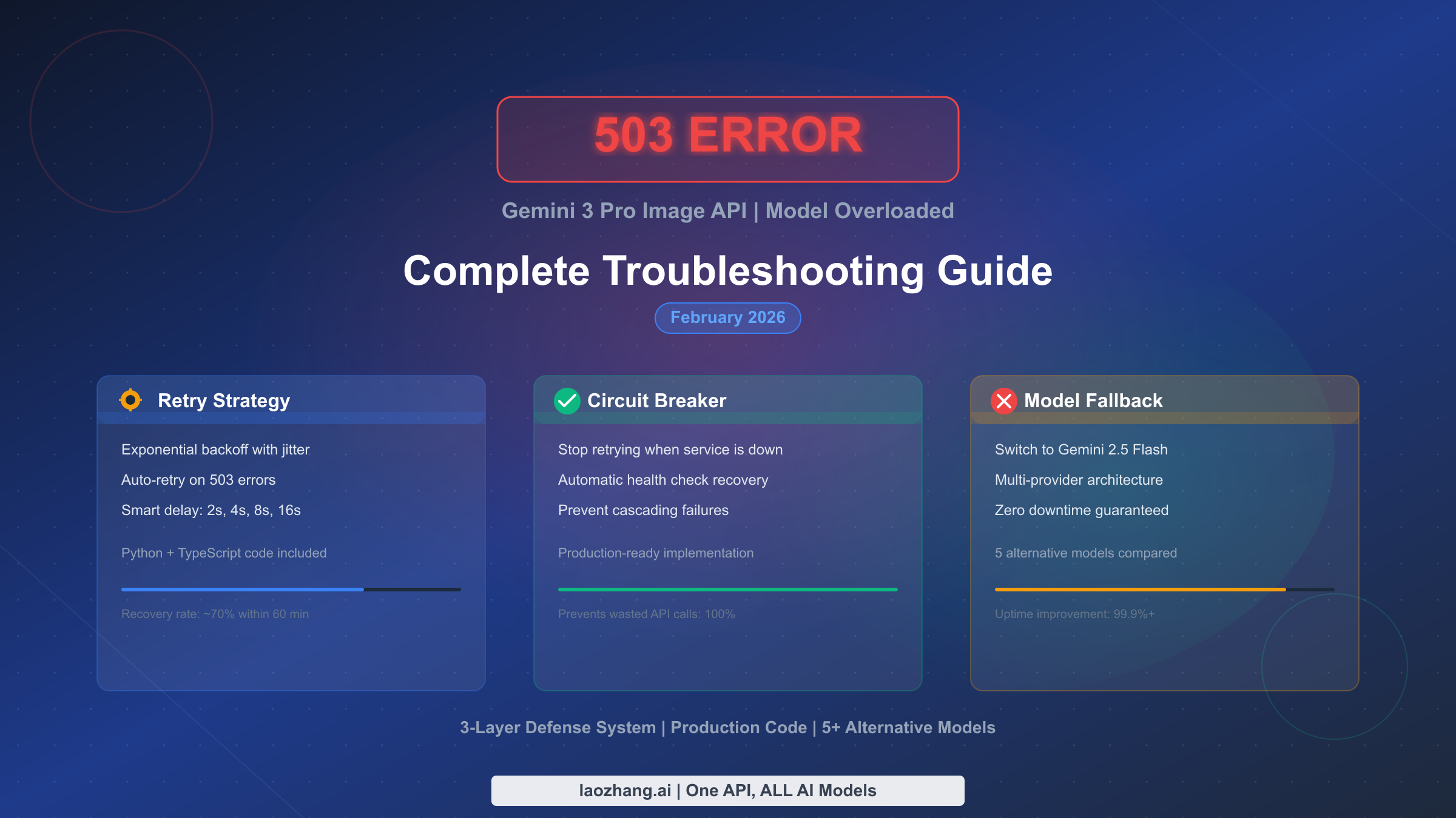 Most guides for handling Gemini 503 errors stop at basic exponential backoff, but production applications need a much more comprehensive approach. The 3-layer defense system we present here combines exponential backoff with jitter (Layer 1), circuit breaking to prevent wasted requests (Layer 2), and automatic model fallback to ensure zero downtime (Layer 3). Together, these three layers handle virtually every failure scenario you will encounter with the Gemini API, turning unpredictable 503 outages into gracefully managed events that your end users may never even notice.