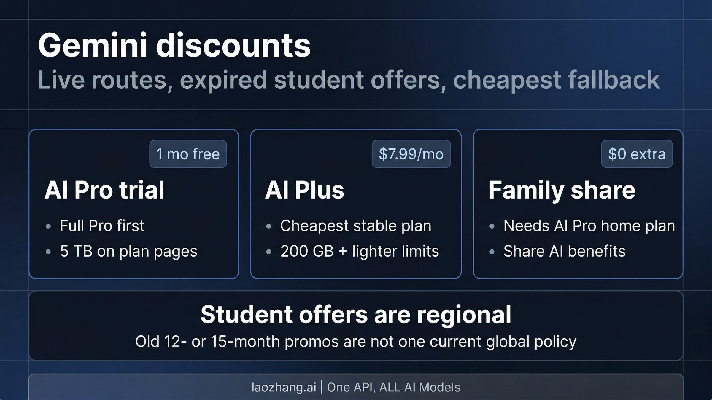 The most important correction is that "Gemini student discount" is no longer the whole story. Google has stable public savings routes that matter more for most readers than chasing old 2025 promotion pages, and the current student surfaces often act more like expiry notices than fresh long-term claim flows. If you are simply comparing monthly price, the live official split is much cleaner than the old promo chatter makes it seem: AI Pro is the premium plan at $19.99 per month in the US, while AI Plus is the cheaper ongoing tier at $7.99 per month with a visible intro offer on the same current subscriptions page.