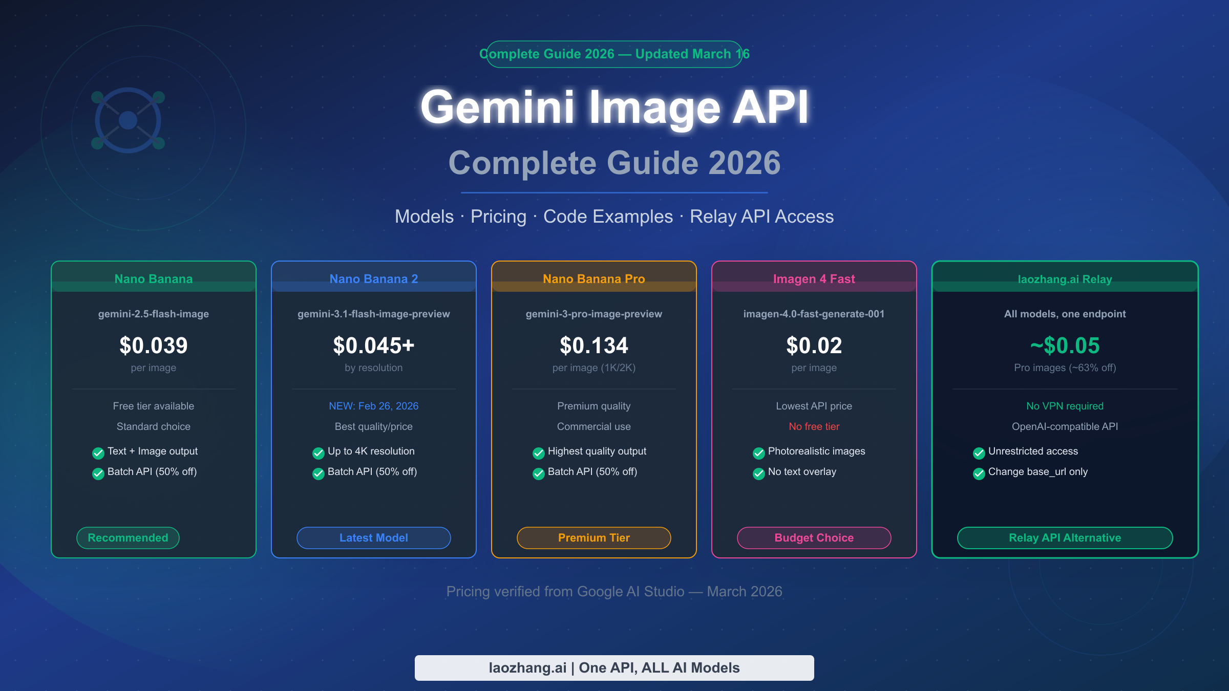 The Gemini Image API gives developers access to five image generation models in 2026: Nano Banana (gemini-2.5-flash-image, from $0.039/image), Nano Banana 2 (gemini-3.1-flash-image-preview, launched February 26, 2026, from $0.045/image at 1K resolution), Nano Banana Pro (gemini-3-pro-image-preview, $0.134/image), and Imagen 4 in three tiers ranging from $0.02 to $0.06 per image. Google AI Studio provides a free tier of approximately 500 requests per day for personal use. For developers in regions where the Google API is restricted, or those seeking lower costs, relay solutions like laozhang.ai provide identical API compatibility at reduced prices. This guide covers everything you need to integrate Gemini image generation into your application in 2026: model selection, step-by-step setup, working code in three languages, full pricing, and relay options.