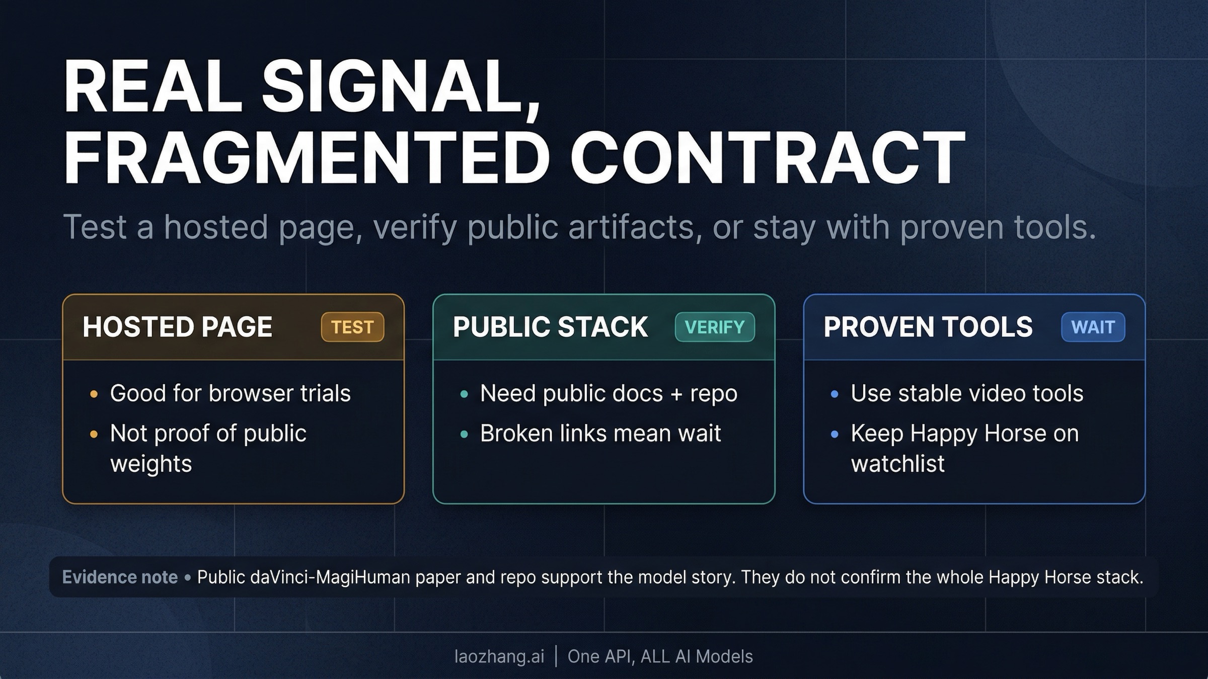 Treat Happy Horse as a real emerging model story with a fragmented current contract. Test it through a hosted page if you are curious, demand readable public artifacts if you are technical, and stay with proven tools if you need production certainty today.