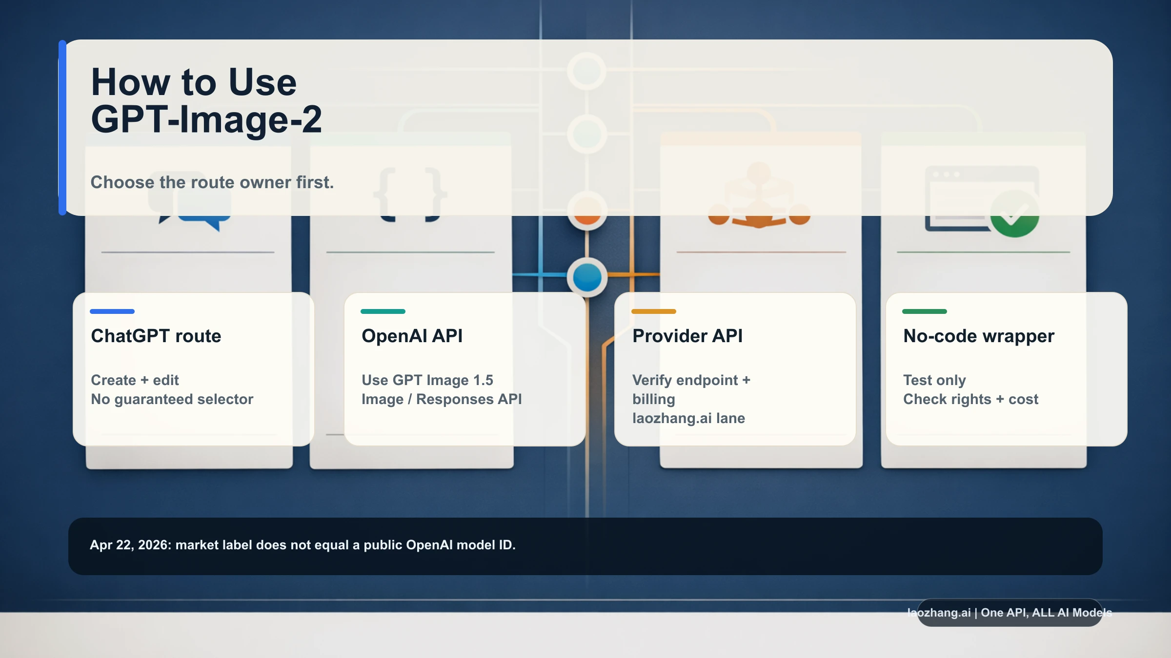 If you want to use GPT-Image-2 today, choose the route owner before you choose prompts. As of April 22, 2026, ChatGPT Images is the consumer route, documented OpenAI GPT Image APIs such as gpt-image-1.5 are the first-party developer route, and any provider or wrapper labeled gpt-image-2 should be treated as a route you must verify before you pay for it or build on it.