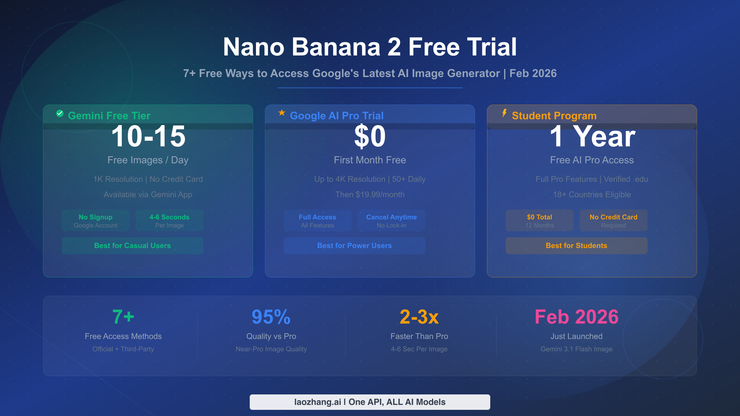 Google just dropped Nano Banana 2 on February 26, 2026, and it immediately became the most talked-about AI image generator on the internet. Built on Gemini 3.1 Flash Image technology, it generates images in just 4-6 seconds — roughly 2-3x faster than the original Nano Banana Pro — while delivering approximately 95% of Pro's image quality. The best part? You do not need to pay a single dollar to start creating. Between the Gemini app's free tier, Google AI Pro's complimentary first month, student programs, and several third-party platforms, there are at least seven distinct ways to access Nano Banana 2 at zero cost. This guide walks you through every single one.