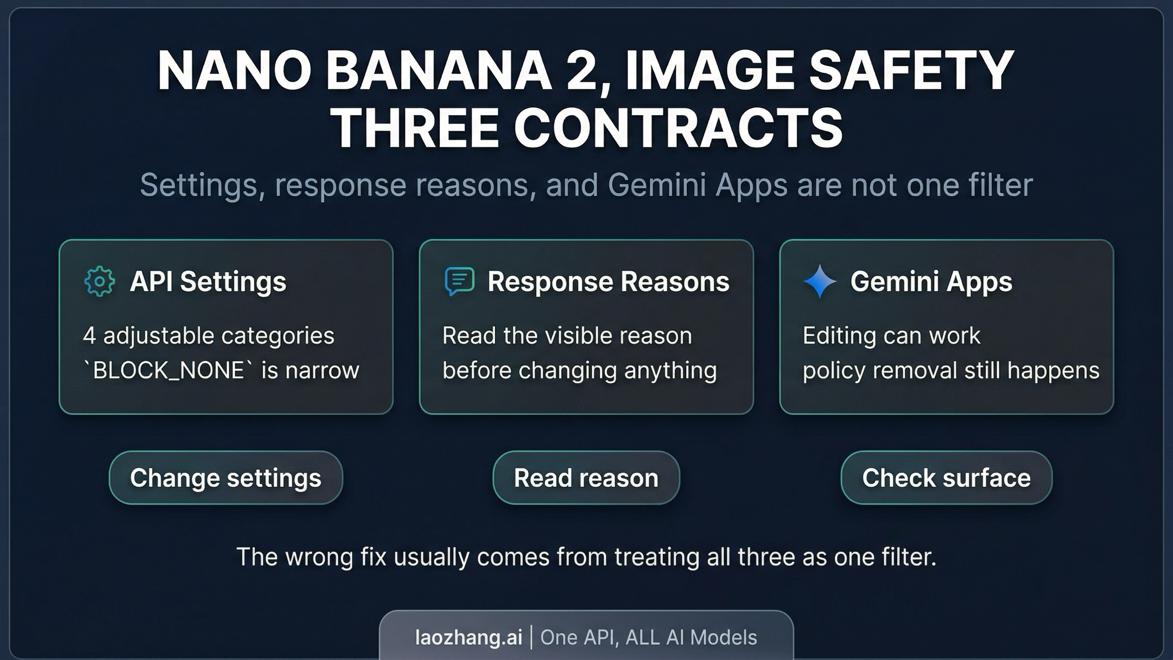In Nano Banana 2, image safety does not name one switch. In the Gemini API, part of it is the adjustable prompt-side safety system. Part of it is the harder response layer that can surface reasons such as OTHER, PROHIBITED_CONTENT, and IMAGE_SAFETY. And in Gemini Apps there is another product-level removal layer on top. Most debugging goes wrong because those three decisions get treated as one filter.