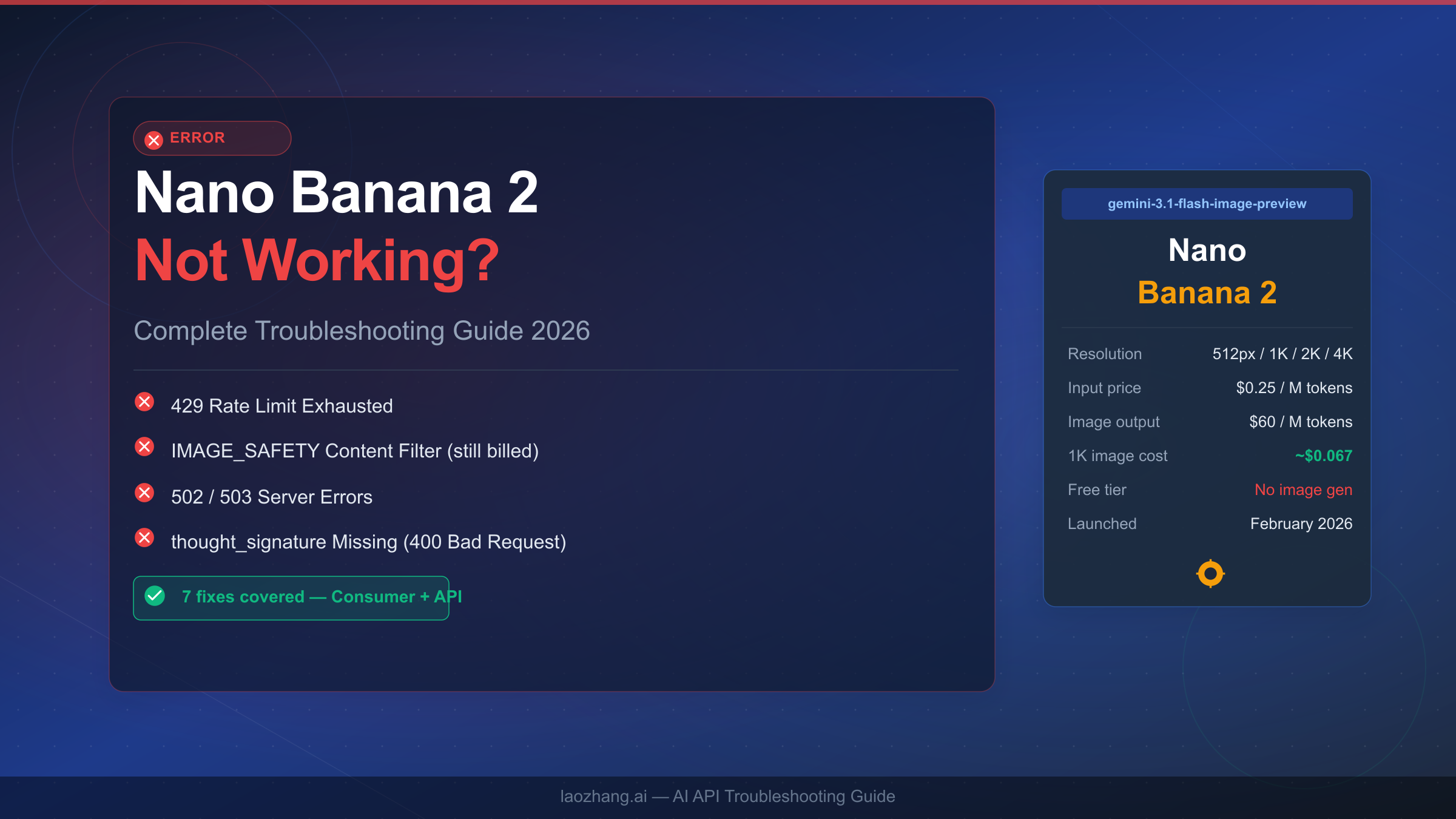 Nano Banana 2 stops generating images for a handful of predictable reasons. Most failures fall into four buckets: you have exhausted your daily quota, the Google server is overloaded (especially between 10:00 and 14:00 UTC), your prompt triggered the IMAGE_SAFETY content filter, or — for developers — a missing thought_signature parameter is breaking your multi-turn API calls. The symptom table in this article will route you directly to your fix in under thirty seconds.
