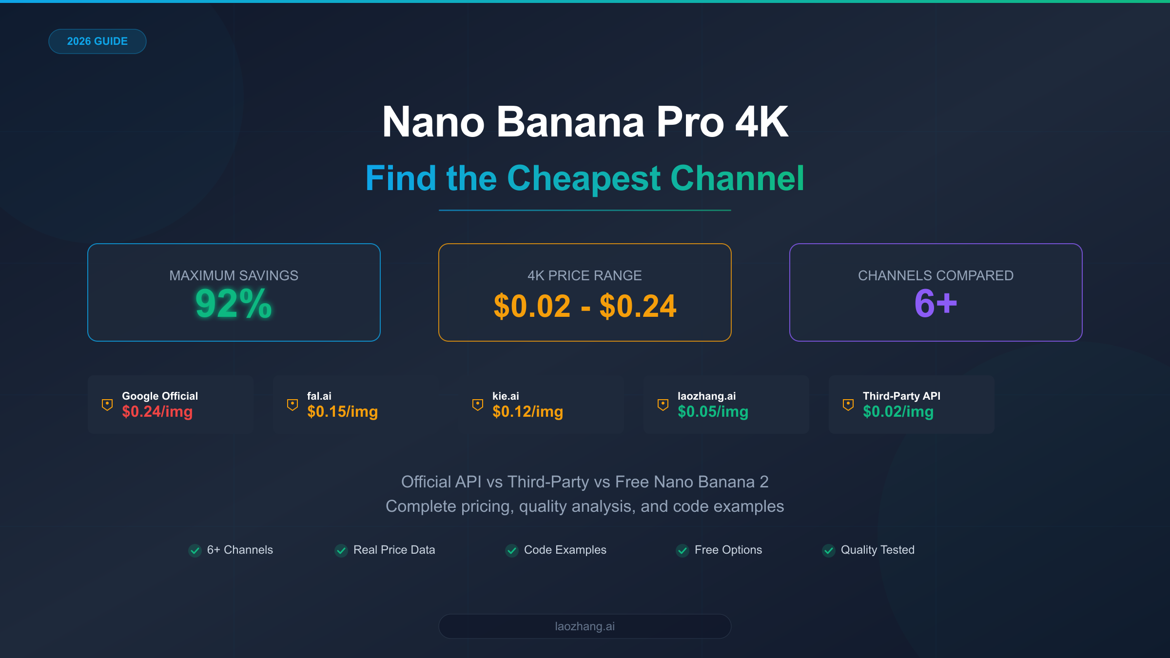 Nano Banana Pro 4K image generation ranges from completely free to $0.24 per image depending on which channel you choose, with third-party APIs offering savings of up to 92% compared to Google's official pricing. As of March 2026, the landscape has shifted dramatically with the release of Nano Banana 2 (Gemini 3.1 Flash Image), which provides free 4K generation through the Gemini app and API access starting at $0.076 per image. This guide compares every available channel, exposes the hidden costs that most pricing articles ignore, and gives you working code to start generating affordable 4K images today.