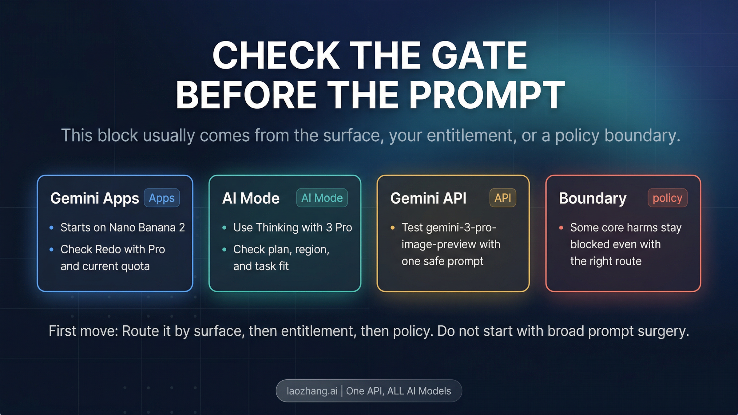 The right fallback depends on which branch you just proved. If Gemini Apps no longer gives you the Pro redo lane, change surfaces or wait for the quota reset. If AI Mode does not fit the task, stop forcing a general image job through a route Google currently positions for structured visuals. If the API route works for a safe control prompt, stop treating the failure as a global Pro outage. And if the safe control also fails, then you are back to a route or entitlement problem, not a policy diagnosis yet.