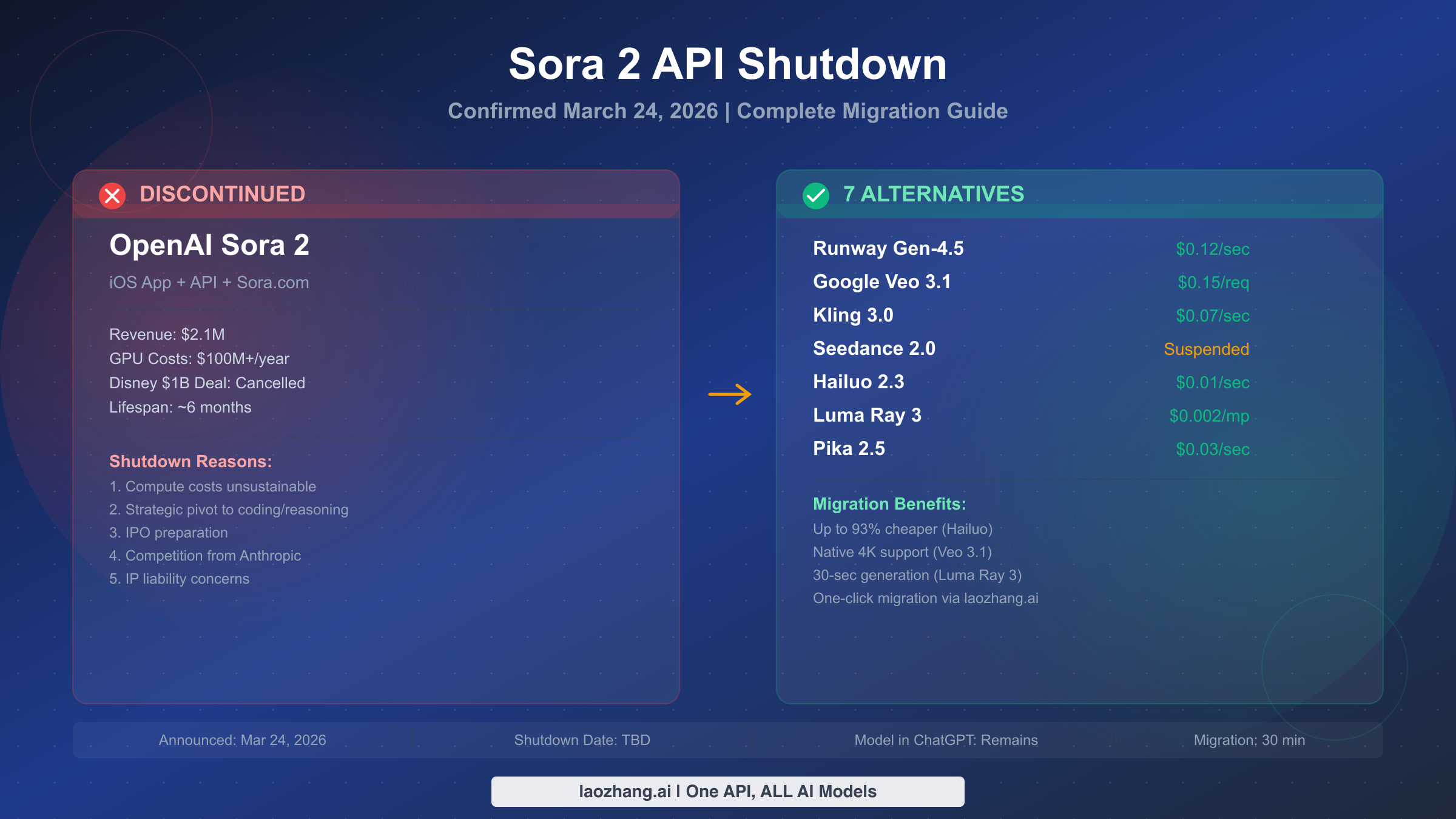 For developers looking for the most cost-effective approach, aggregator platforms like laozhang.ai offer an additional advantage: access to multiple video models through a single API key, with async endpoints that ensure you are never charged for failed generations. This is particularly valuable during the migration period when you may want to test multiple alternatives without managing separate accounts and billing for each provider. For a broader perspective on video generation costs, see our comprehensive guide to AI video generation costs.