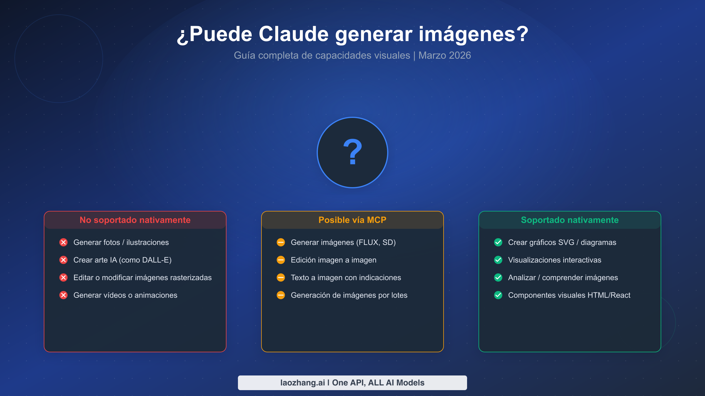 Claude no puede generar imágenes rasterizadas como fotos o ilustraciones de forma nativa, a diferencia de ChatGPT con DALL-E o Gemini con Imagen. Sin embargo, Claude ofrece potentes capacidades visuales que muchos usuarios pasan por alto: puede crear gráficos SVG, gráficos interactivos, diagramas y visualizaciones basadas en React a través de Artifacts. Claude también destaca en el análisis y comprensión de imágenes a través de su función Vision, y puede generar imágenes mediante integraciones MCP (Model Context Protocol) con herramientas como FLUX y Stable Diffusion. Esta guía cubre todas las vías visuales disponibles a marzo de 2026.
