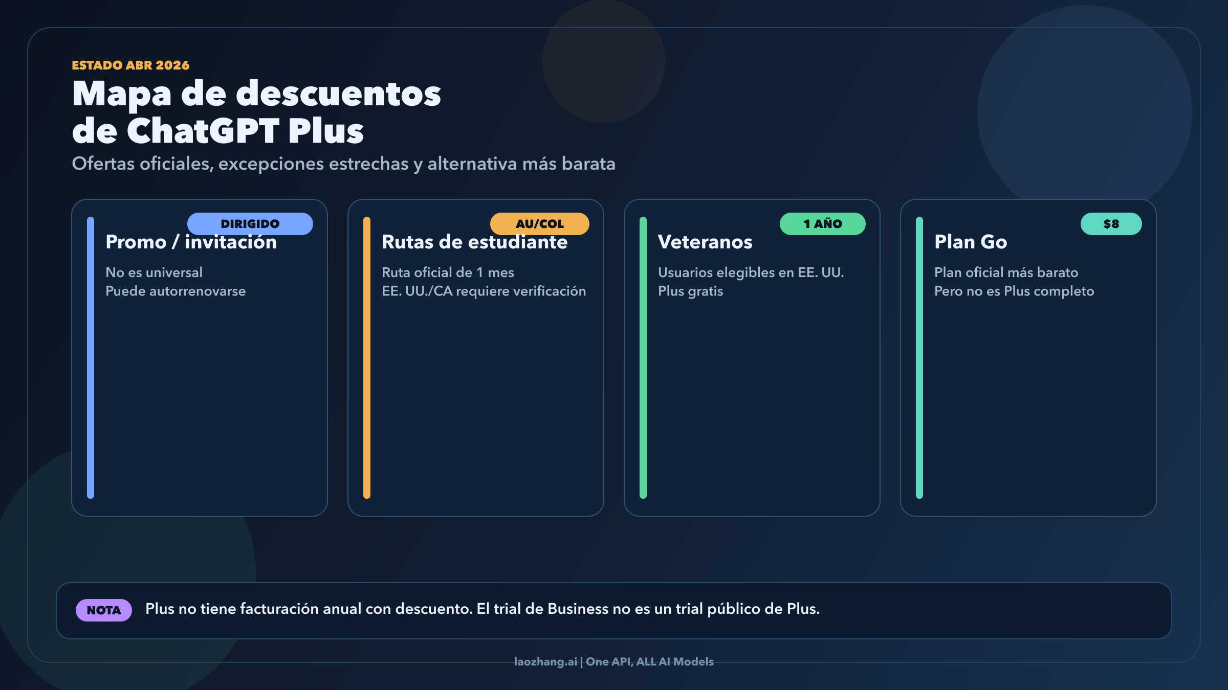 En 2026 ChatGPT Plus todavia puede costar menos que el precio completo, pero mucha gente esta comparando la cosa equivocada desde el principio. A fecha de 2 de abril de 2026, ChatGPT Plus no tiene un descuento publico permanente para todo el mundo ni una ruta oficial de pago anual mas barata. Lo que si queda son varias rutas distintas: promo o invite dirigidos por OpenAI, excepciones muy estrechas como el student referral program de Australia y Colombia o la oferta para veterans en Estados Unidos, y ChatGPT Go si en realidad no necesitas el contrato completo de Plus y solo quieres bajar la cuota mensual.