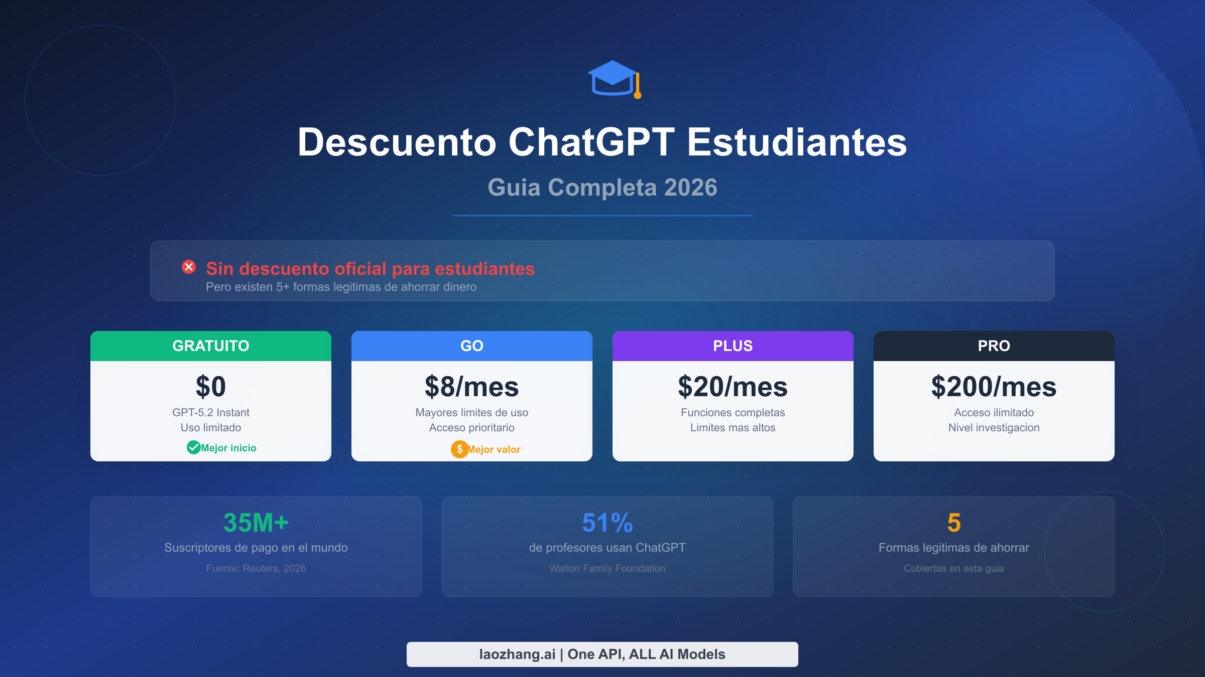 No, OpenAI no ofrece un descuento oficial de ChatGPT para estudiantes a marzo de 2026. Los precios siguen siendo idénticos para todos los usuarios: Gratuito ($0), Go ($8/mes), Plus ($20/mes) y Pro ($200/mes). Sin embargo, los estudiantes no están obligados a pagar el precio completo. Entre el acceso institucional universitario, las promociones regionales, la ruta de API para desarrolladores y alternativas gratuitas genuinamente potentes, existen al menos cinco formas legítimas de acceder a capacidades de IA de nivel ChatGPT sin arruinar un presupuesto estudiantil. Esta guía cubre cada opción de forma honesta: sin compartir cuentas en el mercado gris, sin recomendaciones motivadas por afiliados, solo rutas prácticas que realmente funcionan.