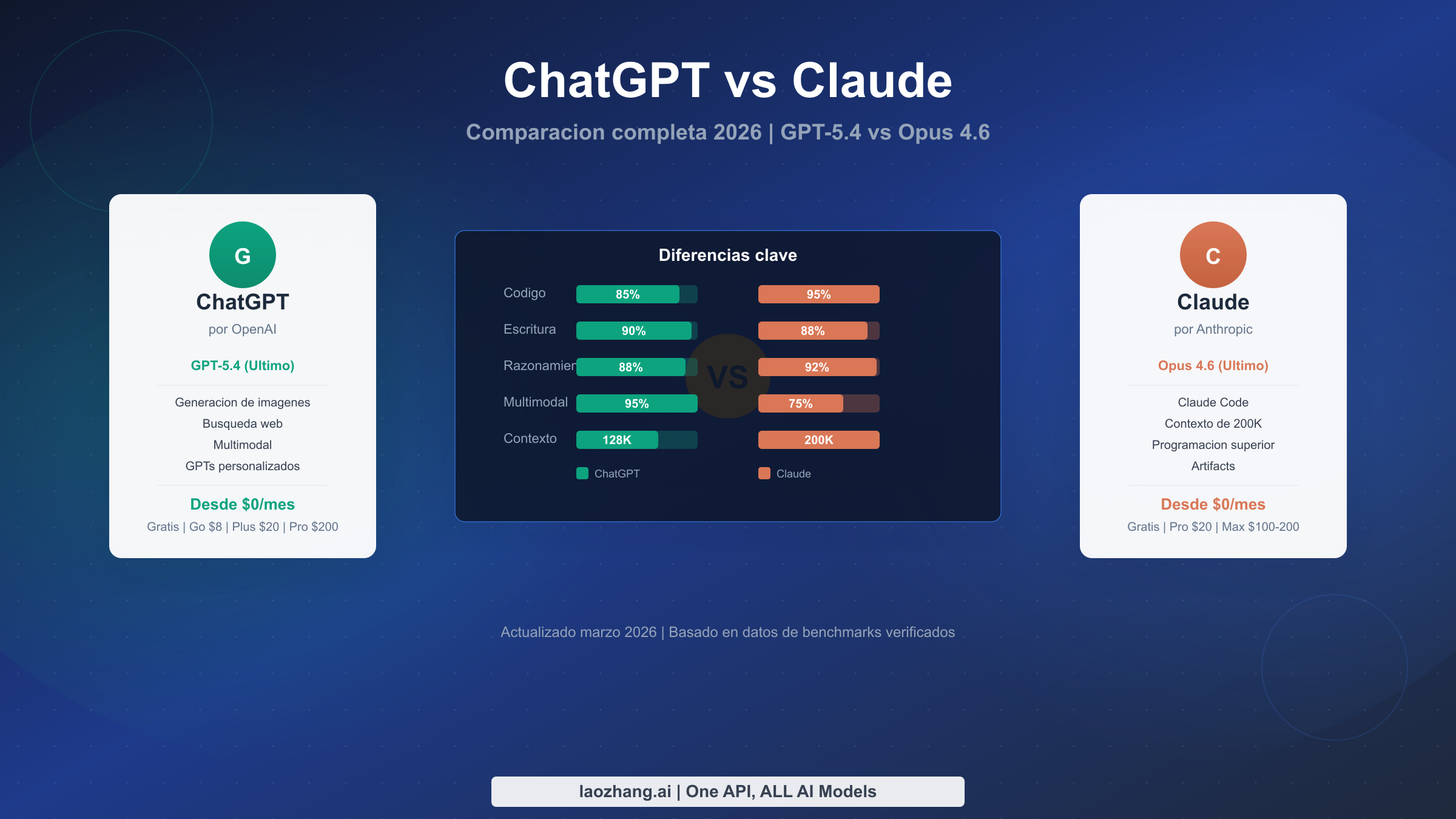 En marzo de 2026, ChatGPT y Claude se posicionan como los dos asistentes de IA mas capaces disponibles tanto para consumidores como para desarrolladores. ChatGPT, impulsado por GPT-5.4 de OpenAI, ofrece capacidades multimodales incomparables que incluyen generacion de imagenes, modo de voz avanzado y busqueda web. Claude, construido sobre Opus 4.6 de Anthropic, domina en precision de codigo, razonamiento profundo y analisis de documentos extensos con su ventana de contexto lider en la industria de 200K tokens. Ambas plataformas ofrecen planes gratuitos y suscripciones estandar de $20/mes, lo que hace que la eleccion no dependa del acceso sino de que fortalezas se alinean mejor con tus necesidades especificas. Esta guia proporciona una comparacion basada en datos en cada dimension relevante, desde puntuaciones de benchmarks hasta economia de API, para que puedas tomar una decision informada.
