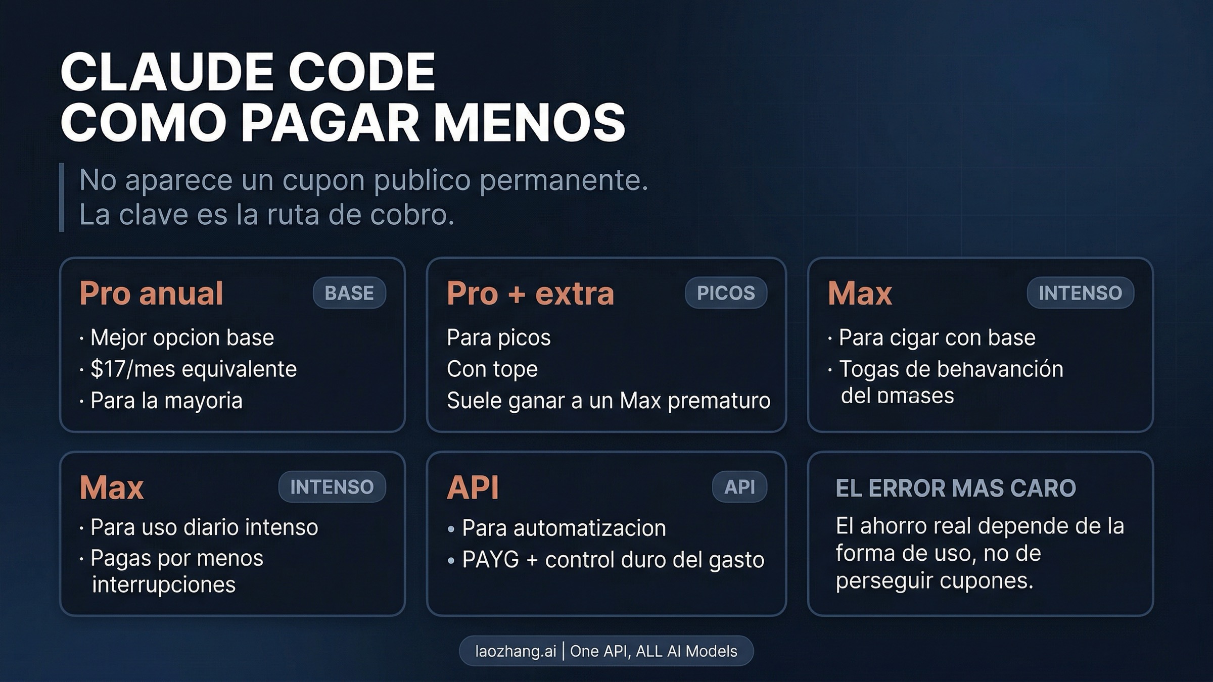Claude Code no parece confuso porque los precios esten escondidos. Parece confuso porque varias decisiones de compra diferentes acaban metidas dentro de una sola palabra: descuento. En cuanto separas cupon, anualidad, uso extra, Max y API billing, la ruta mas barata suele verse mucho mas clara. Empieza por la ruta oficial mas barata que encaje con tu carga real y evita pagar por el sistema equivocado sin darte cuenta.