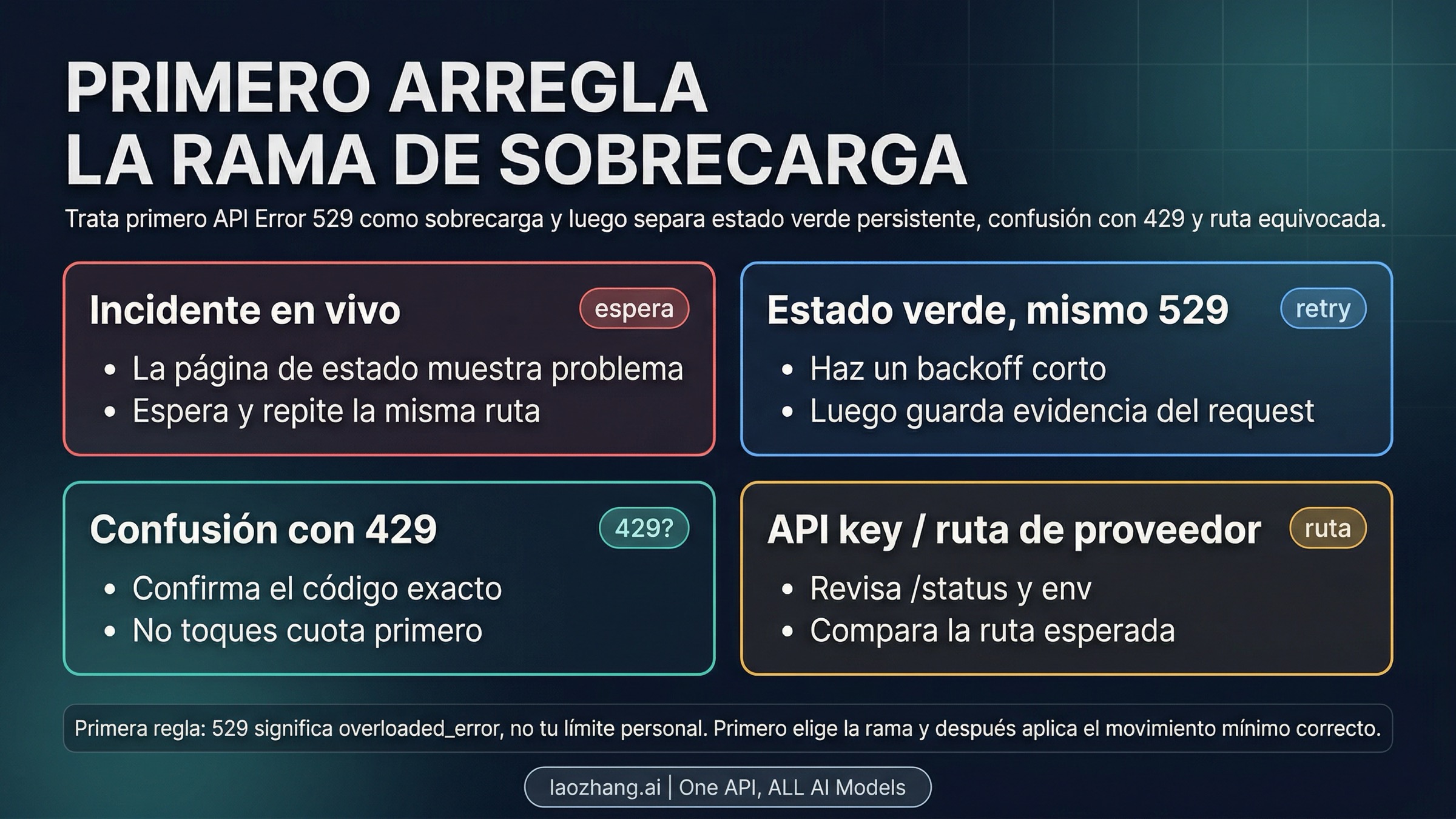 | El status esta en verde pero la misma ruta sigue con 529 | Sobrecarga transitoria o localizada | Haz un bounded retry corto sobre la misma ruta | Comprueba si esa ruta exacta se recupera sin cambiar otras variables | Varios retry cortos sobre la misma ruta siguen dando 529 |