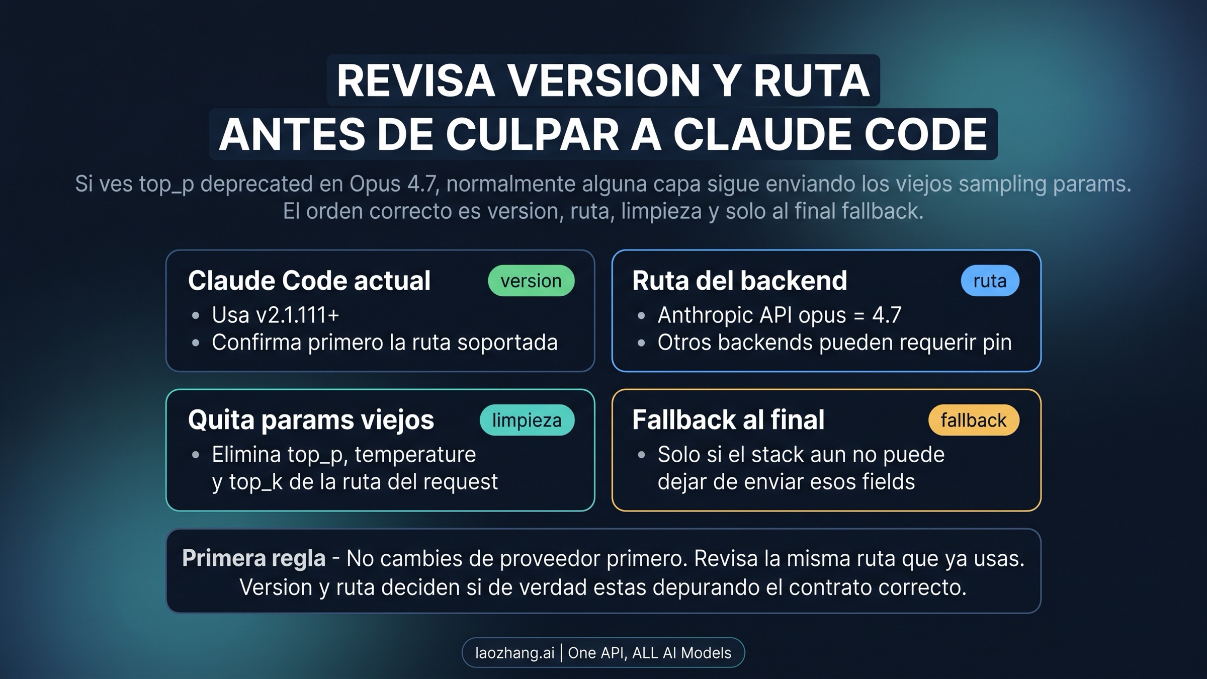 Si Claude Code muestra top_p deprecated en Opus 4.7, tratelo como un request contract mismatch y no como una excusa para cambiar de provider enseguida. Primero version, luego route, despues remove de fields viejos, y verificacion sobre la misma ruta. Si el stack sigue sin poder detenerlos, ahi si aparece el fallback.