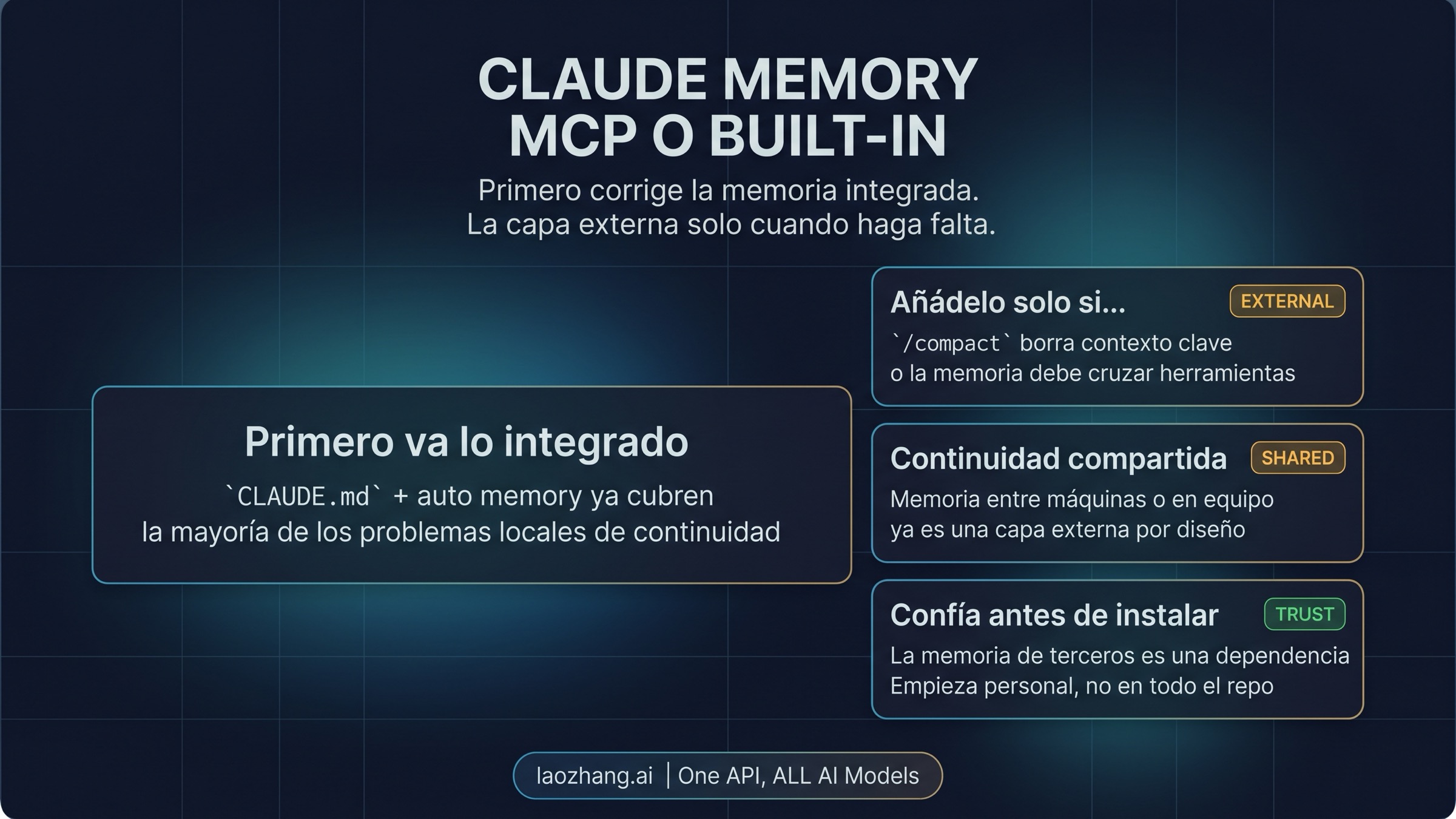 En cuanto separas esas capas, la recomendación cambia enseguida. Si el trabajo sigue siendo repo rules, startup instructions, preferencias repetidas o hábitos de una sola máquina, la primera parada siguen siendo las built-in layers. Si lo que necesitas es sobrevivir a /compact, hacer retrieval entre tools, mantener continuity entre máquinas o compartir memoria con un equipo, entonces un external memory MCP sí se vuelve una opción real.