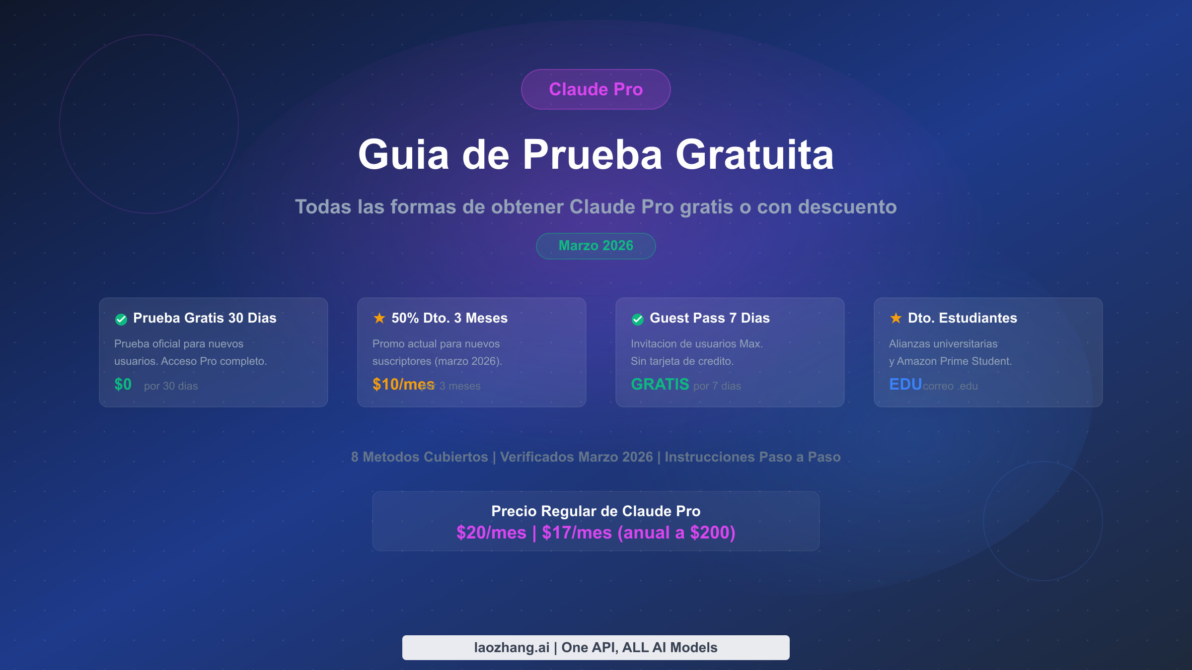Si, Claude Pro ofrece una prueba gratuita para nuevos usuarios. A partir de marzo de 2026, puedes obtener una prueba gratuita completa de 30 dias registrandote en claude.ai con un metodo de pago. Anthropic tambien ejecuta promociones periodicas que incluyen un 50% de descuento durante 3 meses ($10/mes en lugar de $20) y Guest Passes de 7 dias disponibles a traves de suscriptores Max. Los estudiantes pueden acceder a Claude Pro mediante paquetes de Amazon Prime Student y alianzas universitarias. Esta guia cubre los 8 metodos verificados para obtener Claude Pro gratis o con descuento, con instrucciones paso a paso para cada uno.