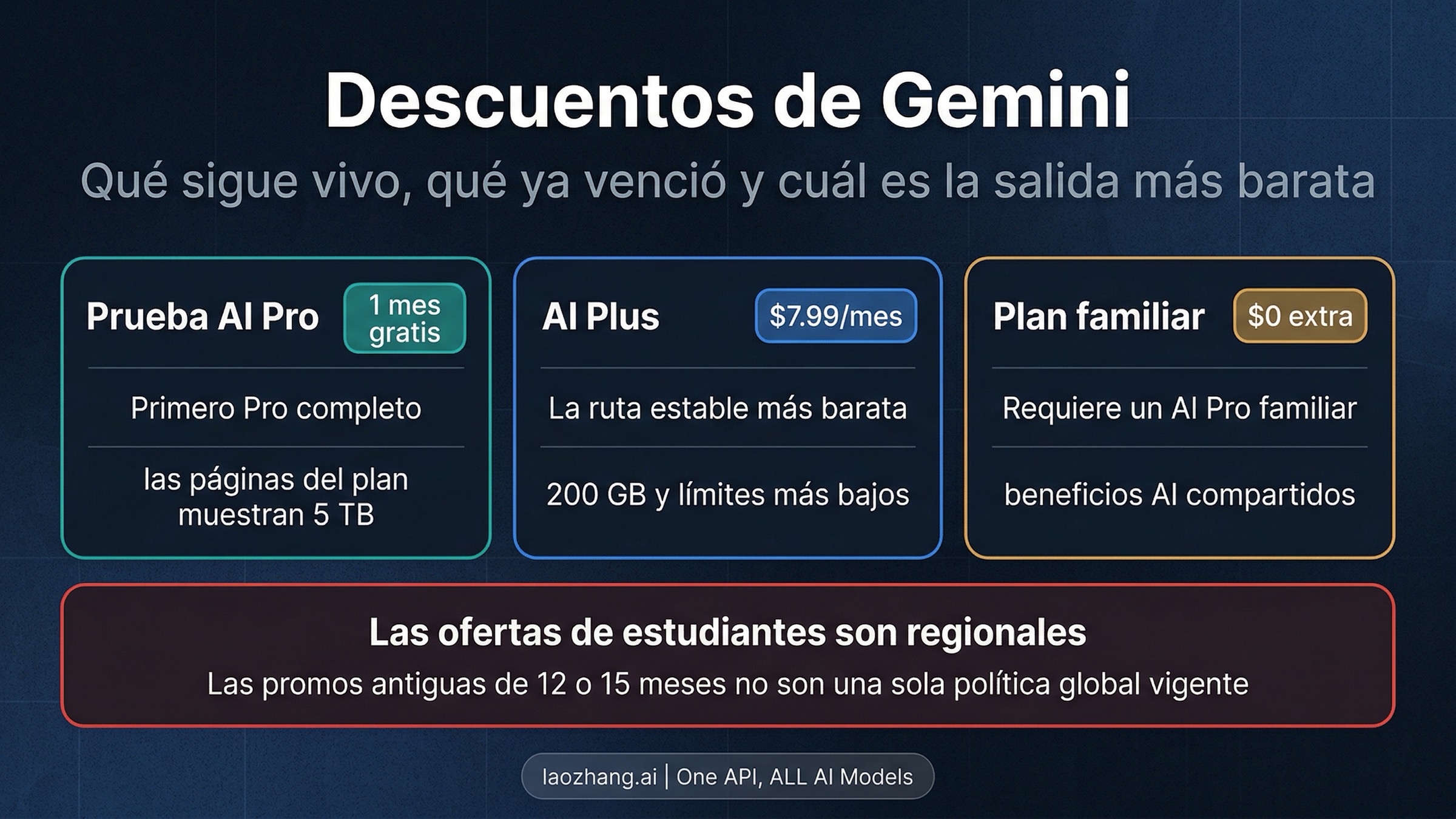 Hay otra distinción importante. Si en realidad lo que buscas no es una suscripción de consumo a Gemini, sino acceso barato para desarrollo, puede que estés resolviendo el problema equivocado. En ese caso te conviene más nuestra guía del nivel gratuito de Gemini API, porque los descuentos de consumo y el precio de la API no responden al mismo contrato.