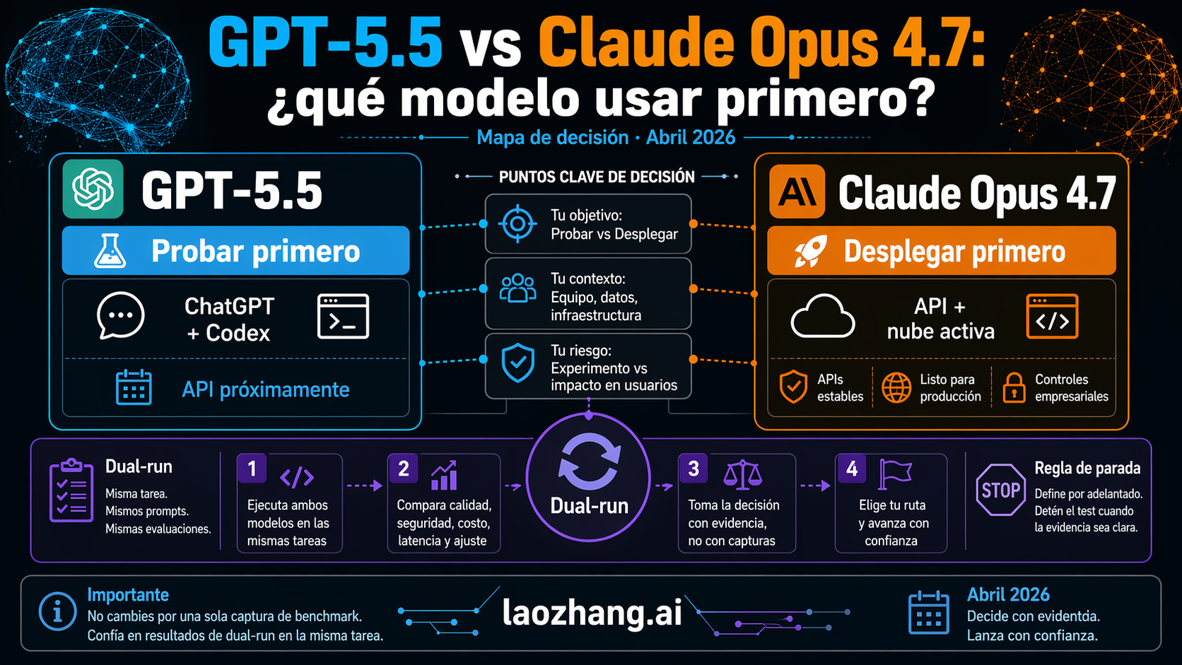 Usa GPT-5.5 primero cuando el trabajo vive dentro de superficies live de OpenAI. Usa Claude Opus 4.7 primero cuando necesitas API o cloud route deployable ahora. Si hay presupuesto o reliability en juego, haz que ambos modelos se ganen el cambio sobre las mismas tareas.