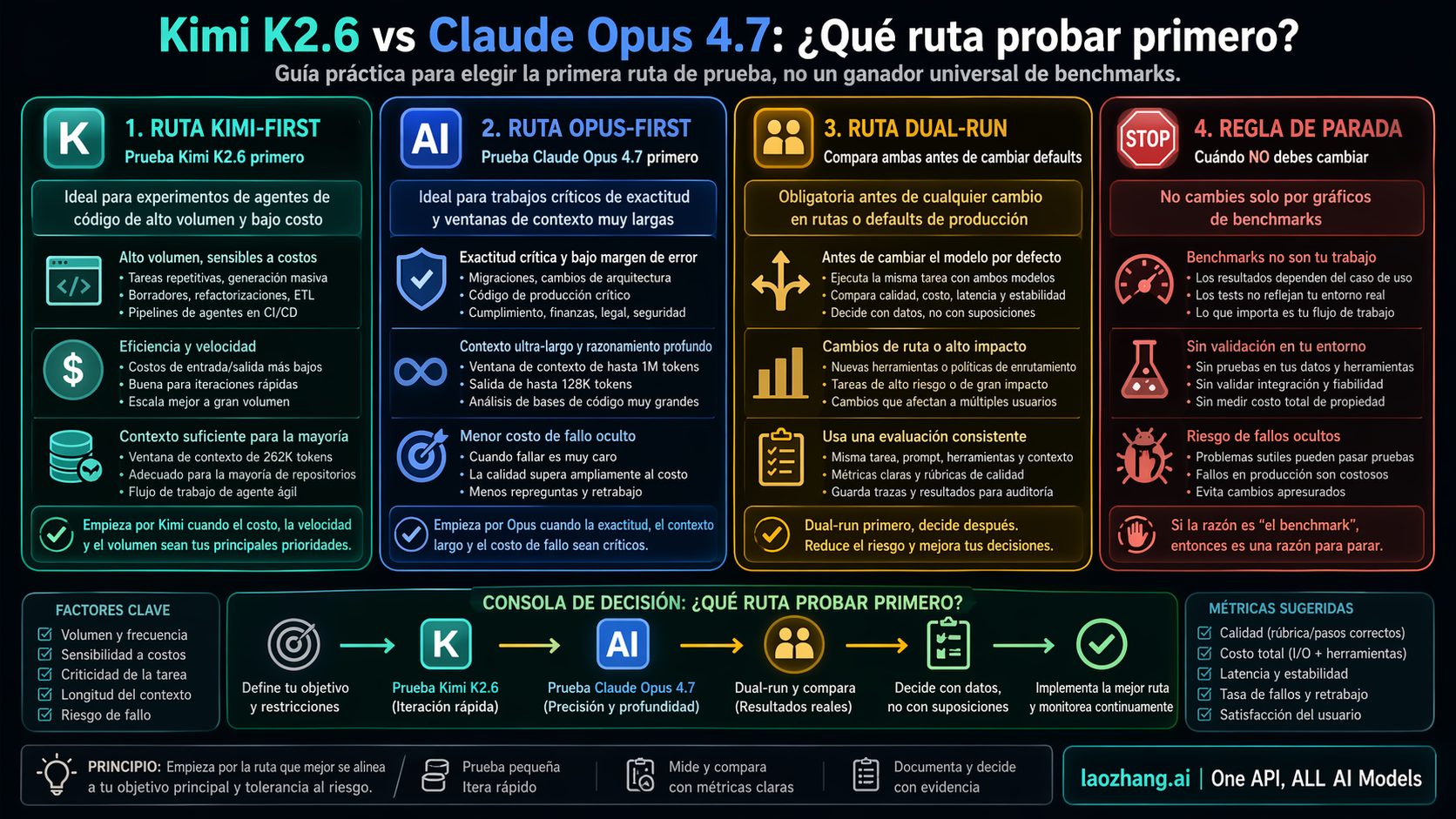Opus 4.7 es la primera opción más segura para coding de alto riesgo, migraciones y trabajo largo. Kimi K2.6 es mejor primer experimento cuando necesitas muchos intentos baratos y puedes revisar o descartar salidas.