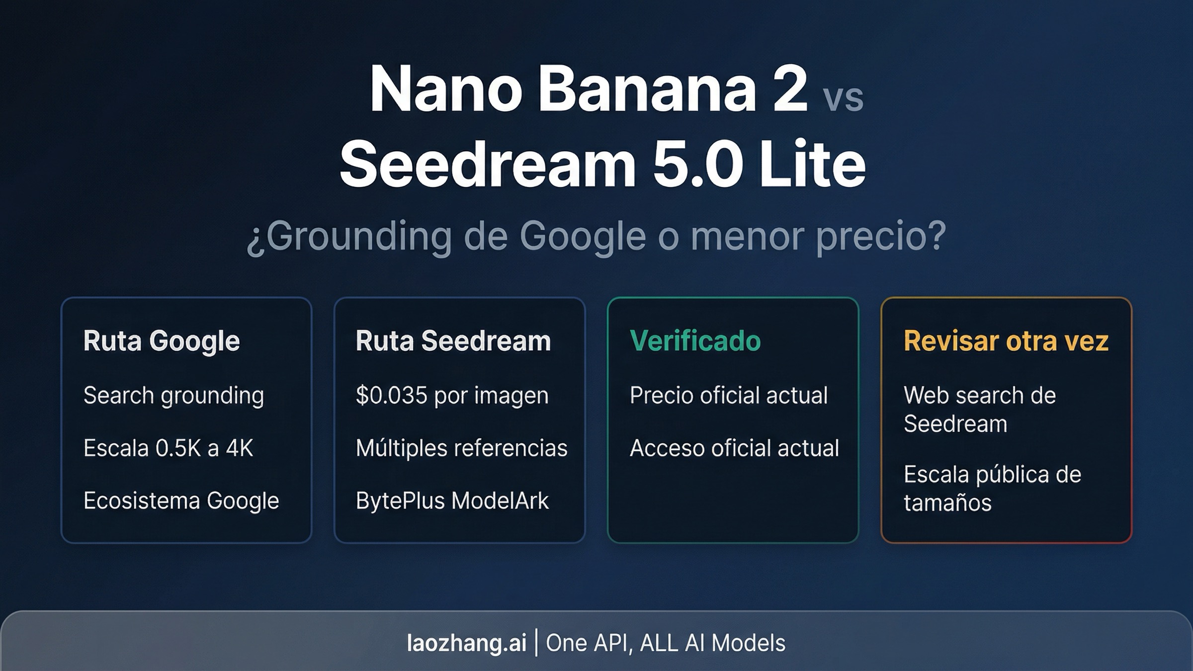 A 3 de abril de 2026, la documentación actual de Google indica de forma explícita que gemini-3.1-flash-image-preview soporta Search grounding y publica precios por tamaño. Las páginas actuales de BytePlus también dejan claro que Seedream 5.0 Lite cuesta \$0.035 por imagen y exponen en ModelArk funciones de texto a imagen, imagen a imagen, varias imágenes de referencia y generación por lotes. Si llegaste aquí a través del alias Nano Banana 2, en el lado de Google eso aterriza en Gemini 3.1 Flash Image Preview; a partir de ahí, lo útil es comparar las rutas oficiales actuales.