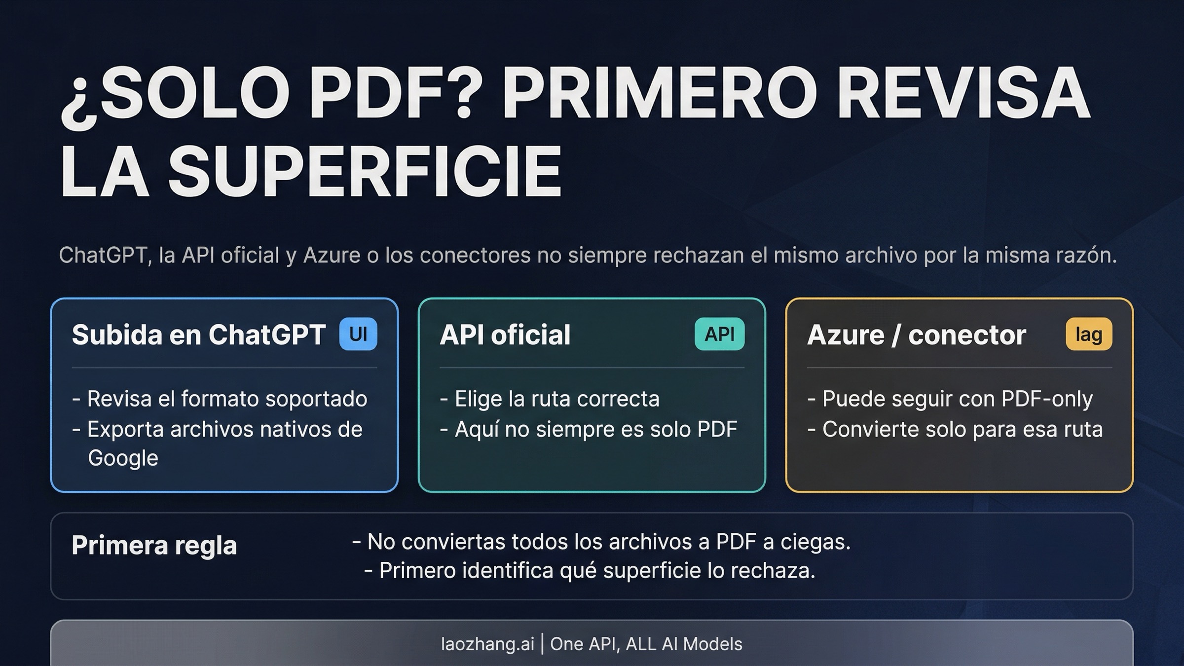 Si el fallo aparece en ChatGPT, primero revisa si el archivo viene de Google Docs, Sheets o Slides y aún no lo has exportado. Si el error aparece en el API oficial actual, primero confirma si la vía correcta para ese trabajo es input_file o file_search. Si el rechazo ocurre en Azure o en un conector, ahí sí es posible que PDF siga siendo la salida más rápida. Después de la corrección mínima, vuelve a probar en la misma ruta. Si esa misma ruta sigue rechazando un archivo claramente soportado, no lo tomes como prueba de que OpenAI ahora solo acepta PDF; tómalo como una señal de que elegiste mal la vía o de que esa entrada todavía va por detrás.