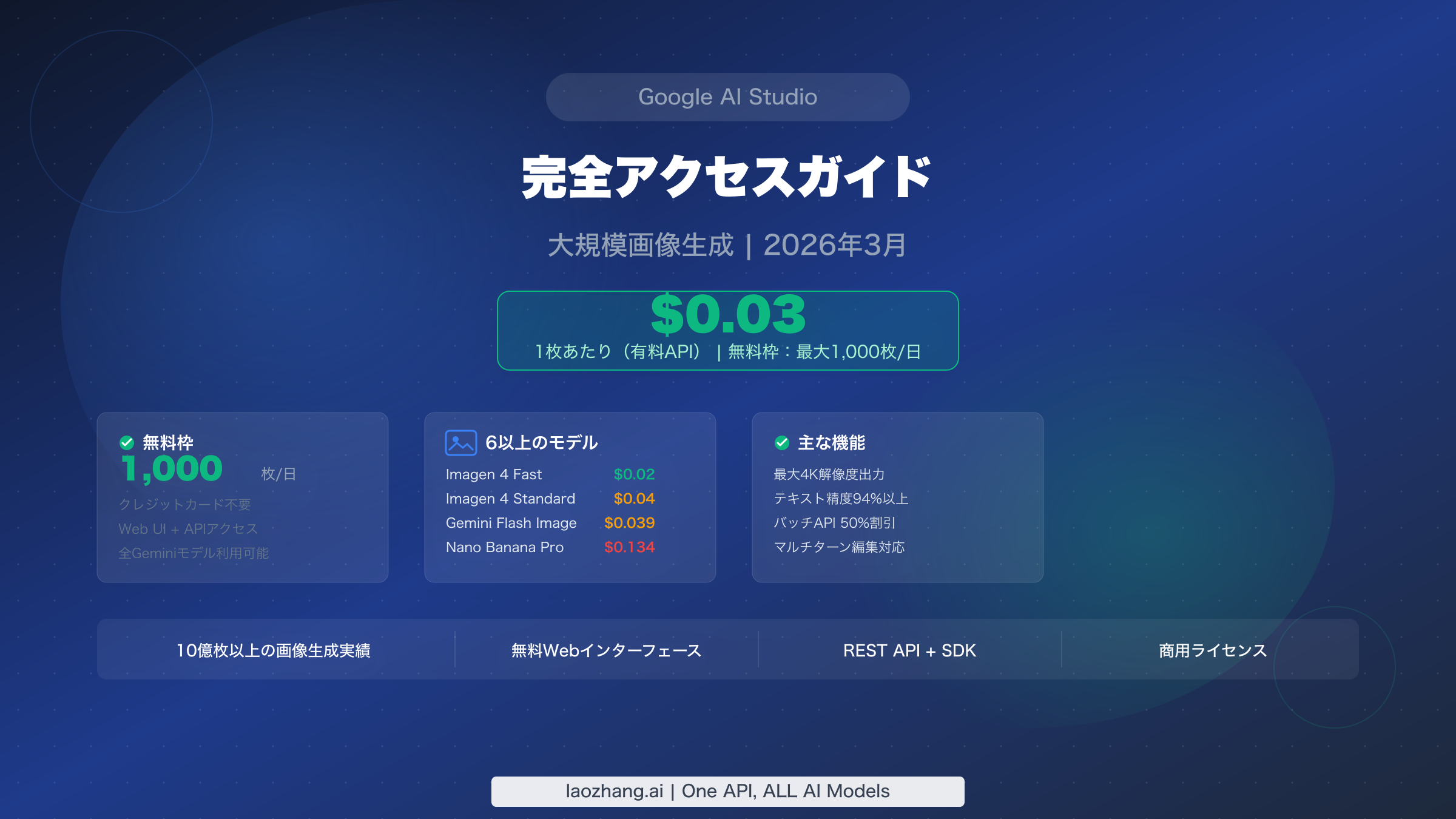 Google AI Studioでは、Imagen 4 Fastモデルを使って1枚わずか$0.02からAI画像を生成できます。さらに無料枠では、ウェブインターフェースだけで毎日最大1,000枚の画像を生成可能です。2026年3月時点で、AI Studioは寛大な無料枠、複数の画像生成モデル(Imagen 4、Gemini Flash Image、Nano Banana Pro)、そして50%のバッチAPI割引をすべて一つのプラットフォームに統合した唯一のサービスです。ブログ記事用に数枚の画像が必要な場合でも、ECパイプライン用に毎日数千枚が必要な場合でも、本ガイドでは現在利用可能なすべてのアクセス方法、料金体系、最適化戦略を詳しく解説します。