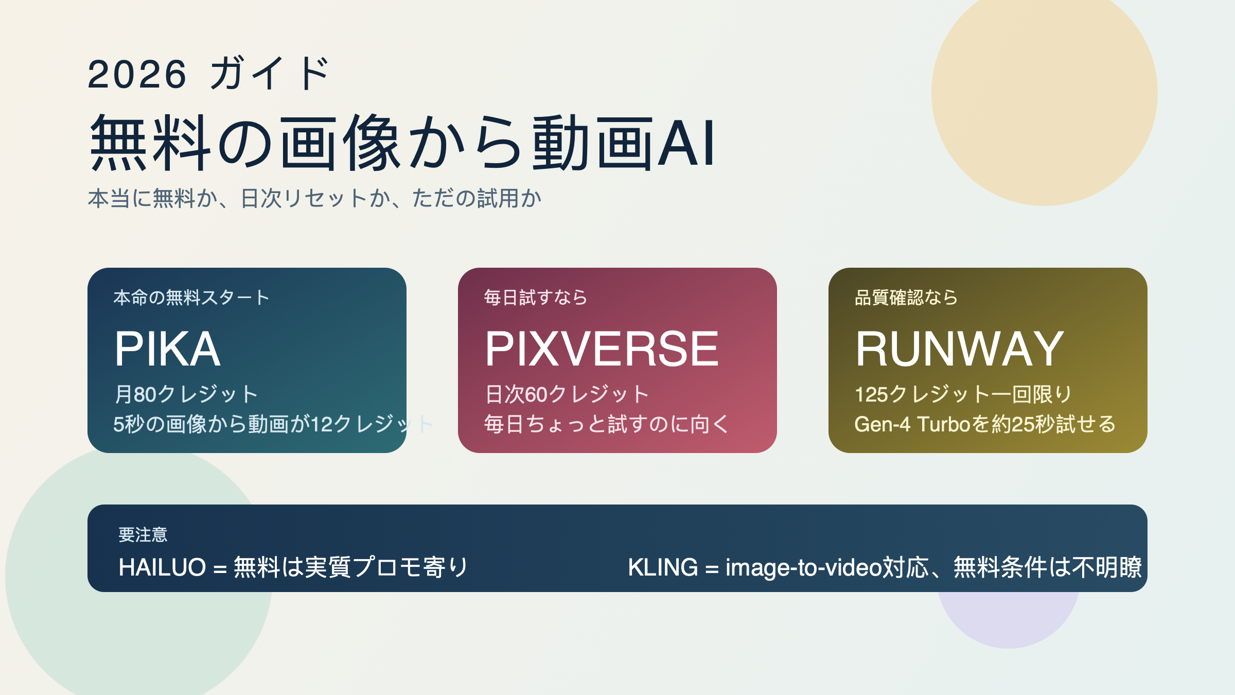 PixVerseやRunwayを先に開く理由は確かにあります。それでも、無料契約の細部で迷いたくないなら、現時点のデフォルト回答は Pika です。