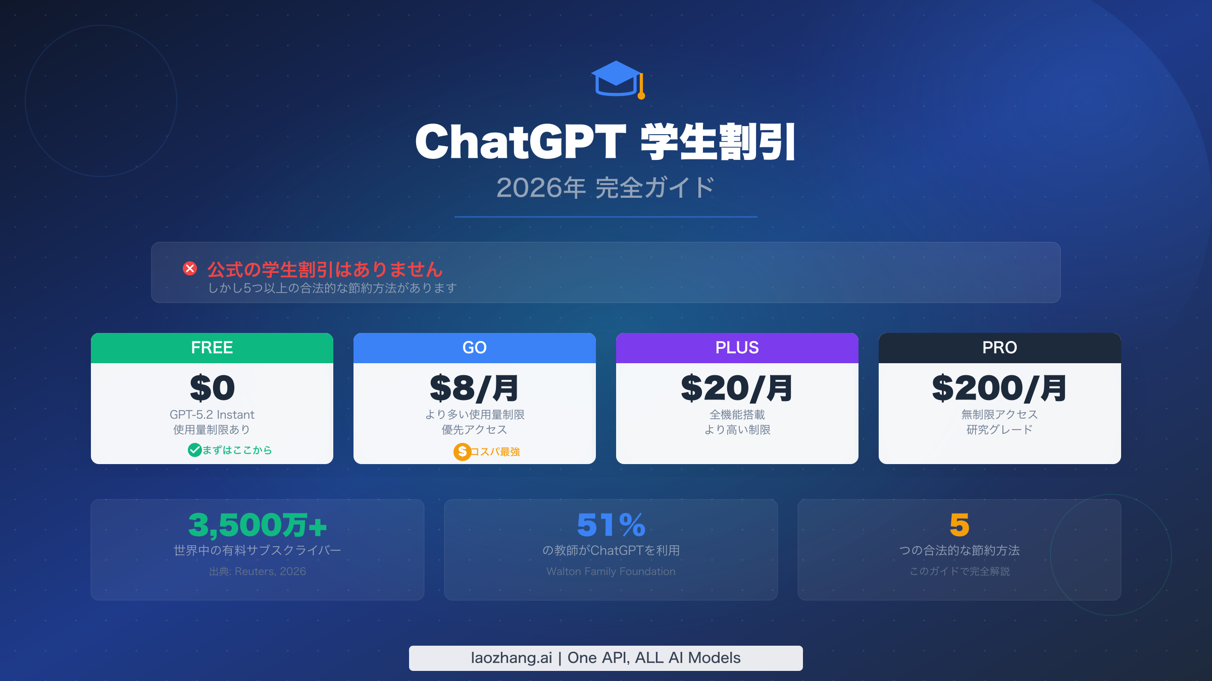 2026年3月現在、OpenAIはChatGPTの公式学生割引を提供していません。料金体系はすべてのユーザーに対して同一で、Free($0)、Go(月額$8)、Plus(月額$20)、Pro(月額$200)となっています。しかし、学生が定価で支払うしかないわけではありません。大学の機関アクセス、地域限定プロモーション、開発者API経由のアクセス、そして本格的な無料代替サービスを活用すれば、学生予算を圧迫せずにChatGPTレベルのAI機能を利用する方法が少なくとも5つあります。このガイドでは、すべての選択肢を正直に解説します。グレーマーケットのアカウント共有やアフィリエイト目的の推薦は一切ありません。