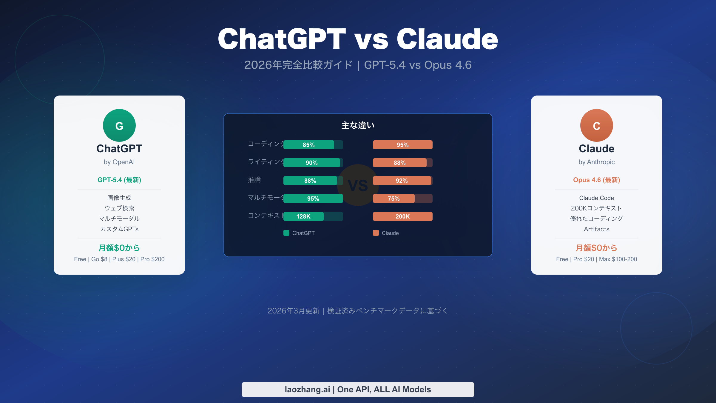 2026年3月の時点で、ChatGPTとClaudeは、一般ユーザーと開発者の両方にとって最も優れた2大AIアシスタントとして存在感を示しています。OpenAIのGPT-5.4を搭載したChatGPTは、画像生成、高度な音声モード、ウェブ検索を含む比類のないマルチモーダル機能を提供しています。一方、AnthropicのOpus 4.6を基盤とするClaudeは、コーディング精度、深い推論、そして業界をリードする200Kコンテキストウィンドウによる長文分析で優位に立っています。両プラットフォームとも無料プランと月額$20のスタンダードサブスクリプションを提供しており、選択のポイントはアクセスの可否ではなく、どちらの強みがあなたの具体的なニーズに合致するかにあります。本ガイドでは、ベンチマークスコアからAPIのコスト効率まで、あらゆる重要な次元でデータに基づいた比較を提供し、最適な判断を支援します。