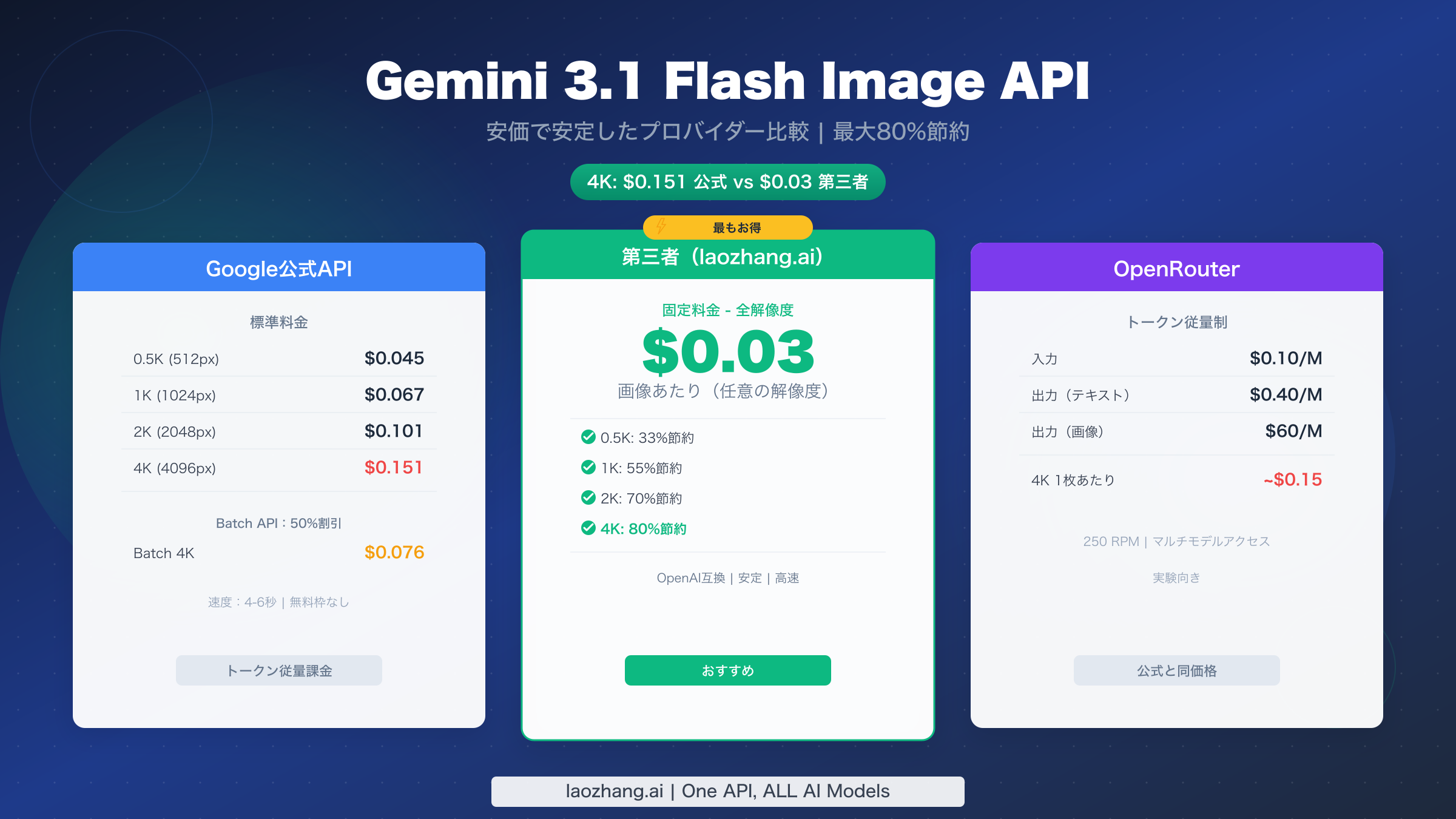 | 4K(4096px) | 約2,520 | $0.151 | $0.076 | $0.03 | 80% |
