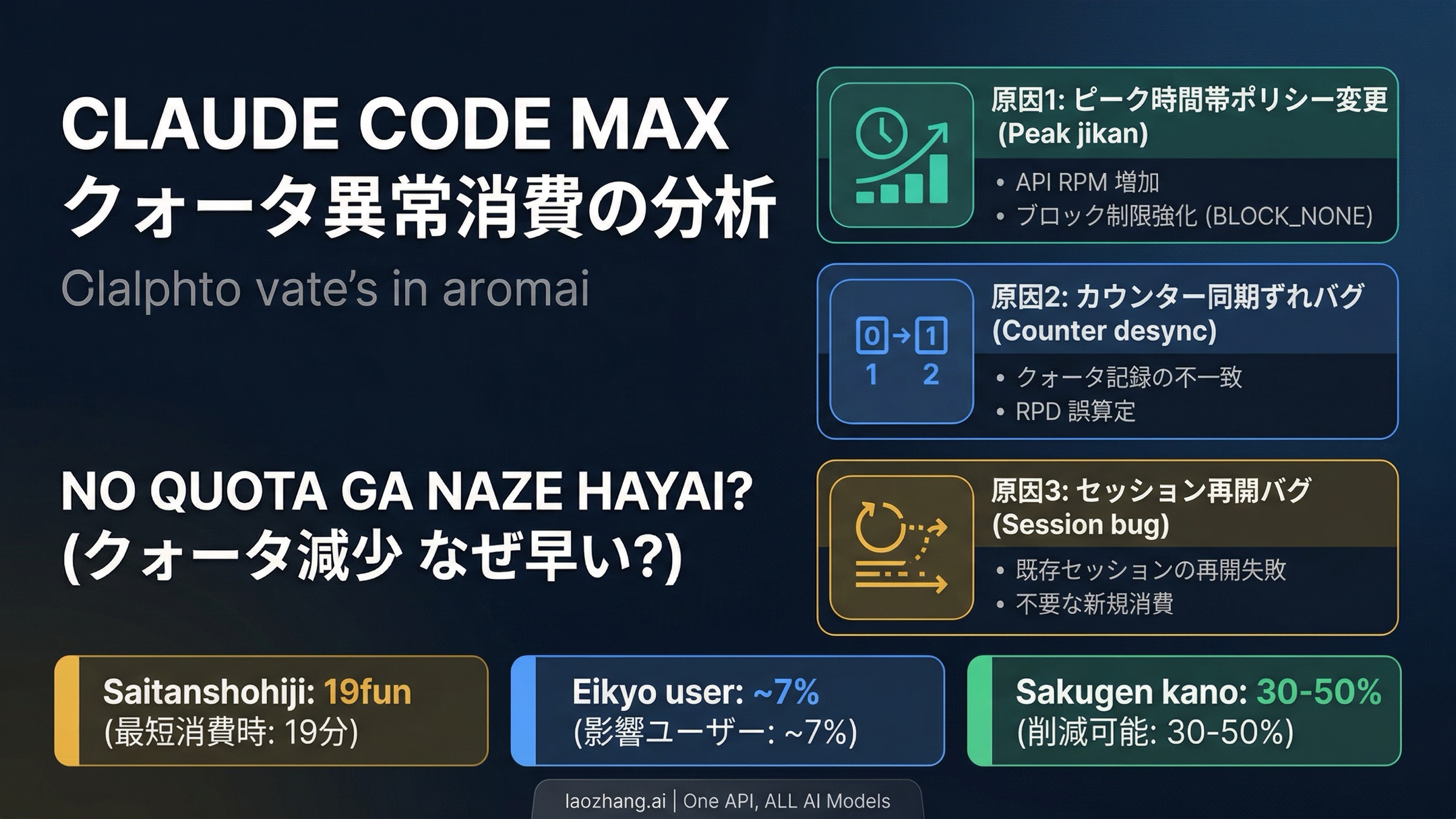 2026年3月下旬に3つの重複する原因が収束しました:Anthropicの意図的なピーク時間帯調整(PT午前5時〜11時はクォータをより速く消費する)、確認済みのカウンター非同期バグ(GitHub Issues #38335、#38029、#37436)、そして3月の2倍オフピークプロモーションの終了です。本ガイドの3ステップ診断フレームワークを使用して、具体的にどの原因があなたに影響を与えているかを特定してください。