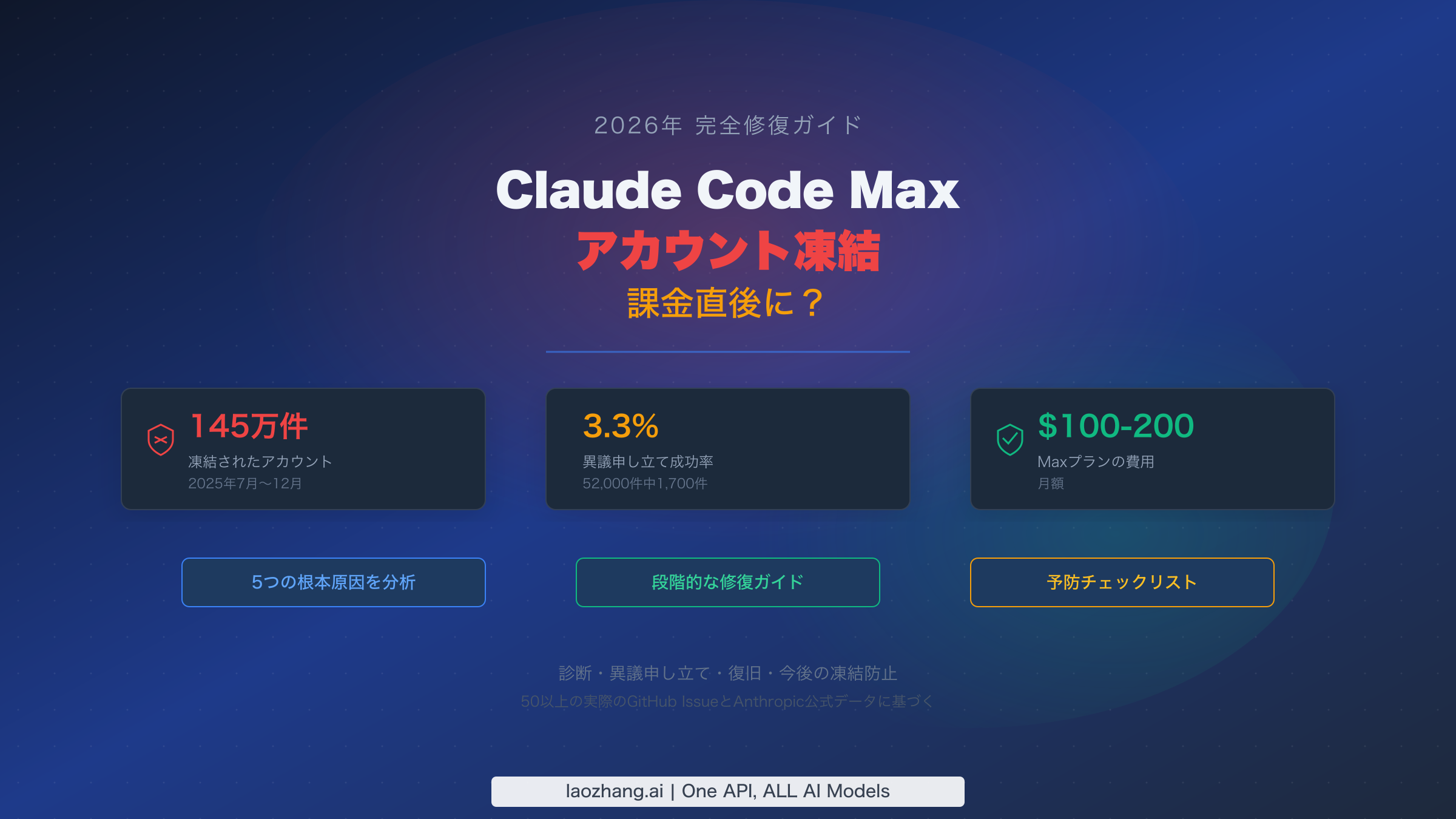 Claude Code Maxのサブスクリプションに$100や$200を支払った直後にアカウントへアクセスできなくなる――これほど苛立たしい経験はありません。Anthropicの透明性ハブ(2026年1月29日公開)によると、2025年下半期だけで約145万件のアカウントが凍結されました。52,000件の異議申し立てのうち、復旧に成功したのはわずか1,700件で、成功率はたったの3.3%です。もしアップグレード直後に「This organization has been disabled」や「Your account has been disabled」というメッセージが表示されたなら、このガイドで何が起きたのか、状況の診断方法、そして次に取るべき行動を詳しく解説します。