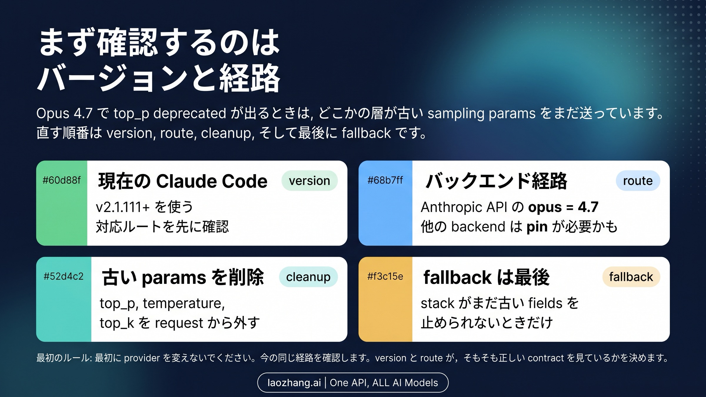 Claude Code が Opus 4.7 で top_p deprecated を返したら、それを provider shopping の合図ではなく、request contract mismatch として扱ってください。先に version、次に route、その後で old fields を remove し、同じ path を verify する。それでも stack が止められないなら、その時だけ fallback を使います。
