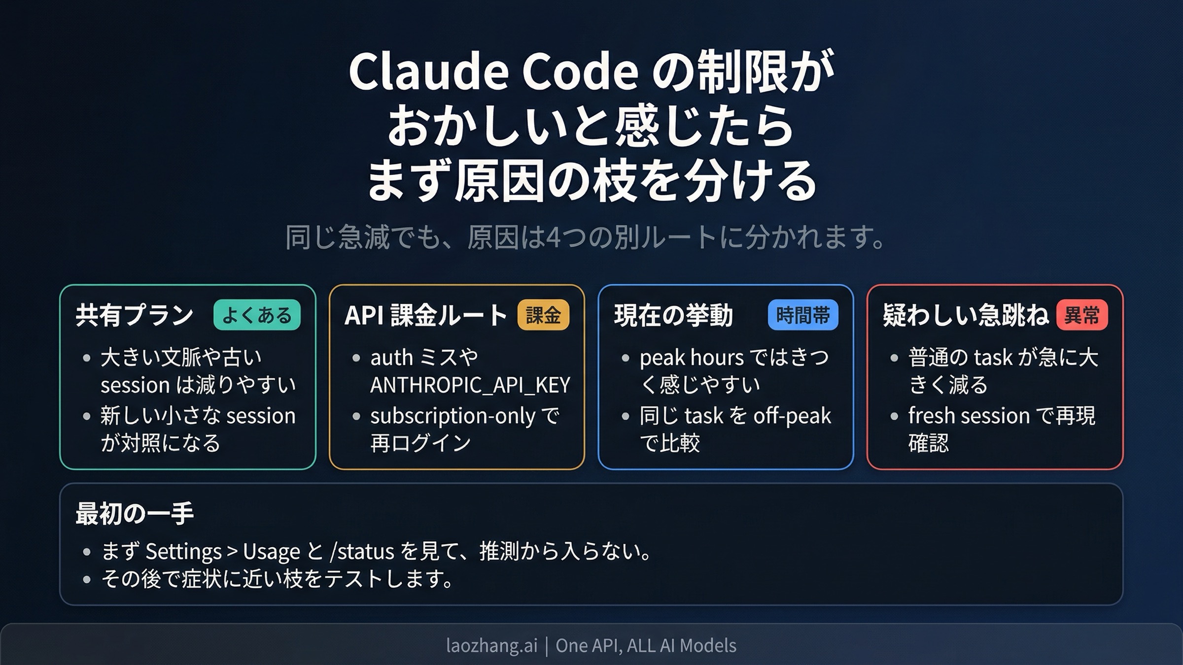 Claude Code の使用制限がおかしいと感じたら、最初に聞くべきことは「正確なクォータはいくつか」ではなく、「今ぶつかっているのはどの usage system なのか」です。多くの「こんなに早く減るのはおかしい」という不満は、実際には四つの枝に分かれます。重いセッションで共有プラン usage が普通に減っているのか、API 課金経路に乗ってしまったのか、平日ピーク時の挙動なのか、それとも切り分けるべき異常スパイクなのかです。