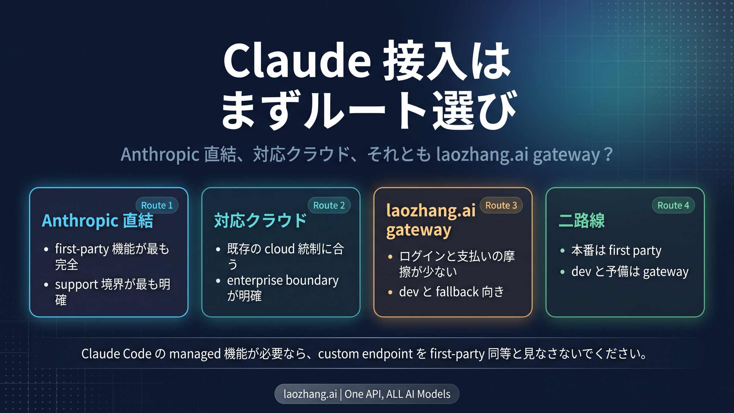Claude や Claude Code を安定して使いたいなら、先に分けるべきなのは Anthropic 直結、対応クラウド、そして laozhang.ai のような互換ゲートウェイという三つの接続ルートです。
