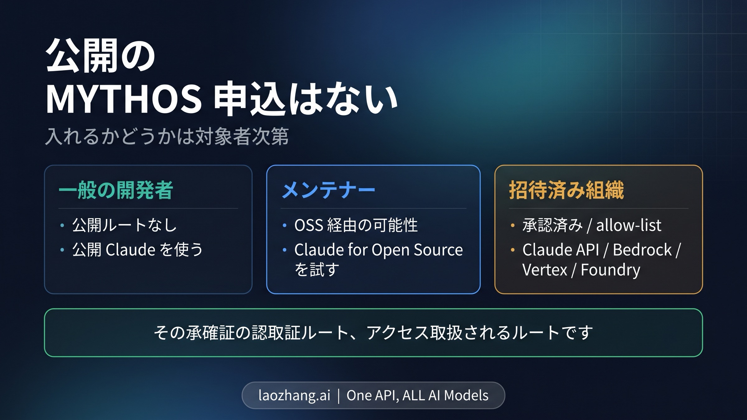 | すでに Project Glasswing や他の招待組織に入っている | ある | 承認後に Claude API、Bedrock、Vertex AI、Foundry のどれかで Mythos を使える可能性があります。 |
