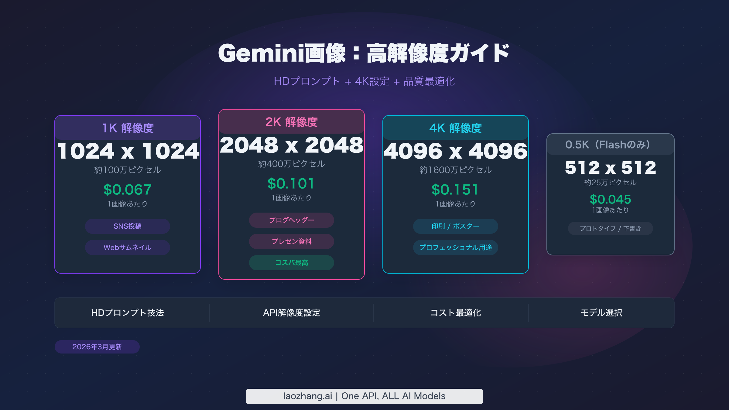 Geminiは4つの解像度ティアに対応しています:0.5K(512px、$0.045)、1K(1024px、$0.067、デフォルト)、2K(2048px、$0.101)、4K(4096px、1画像あたり$0.151)。真の高解像度出力を得るには、API設定でimageSize: "4K"を指定するか、Geminiアプリの解像度ドロップダウンを選択する必要があります。「HD」や「高解像度」などのプロンプトキーワードは視覚スタイルに影響するだけで、実際のピクセル数は変わりません。最良の結果を得るには、詳細なプロンプト(カメラスペック、ライティング、テクスチャの記述)と用途に適した解像度設定を組み合わせてください。多くのユーザーにとって、2Kが品質とコストの最適なバランスを提供します。
