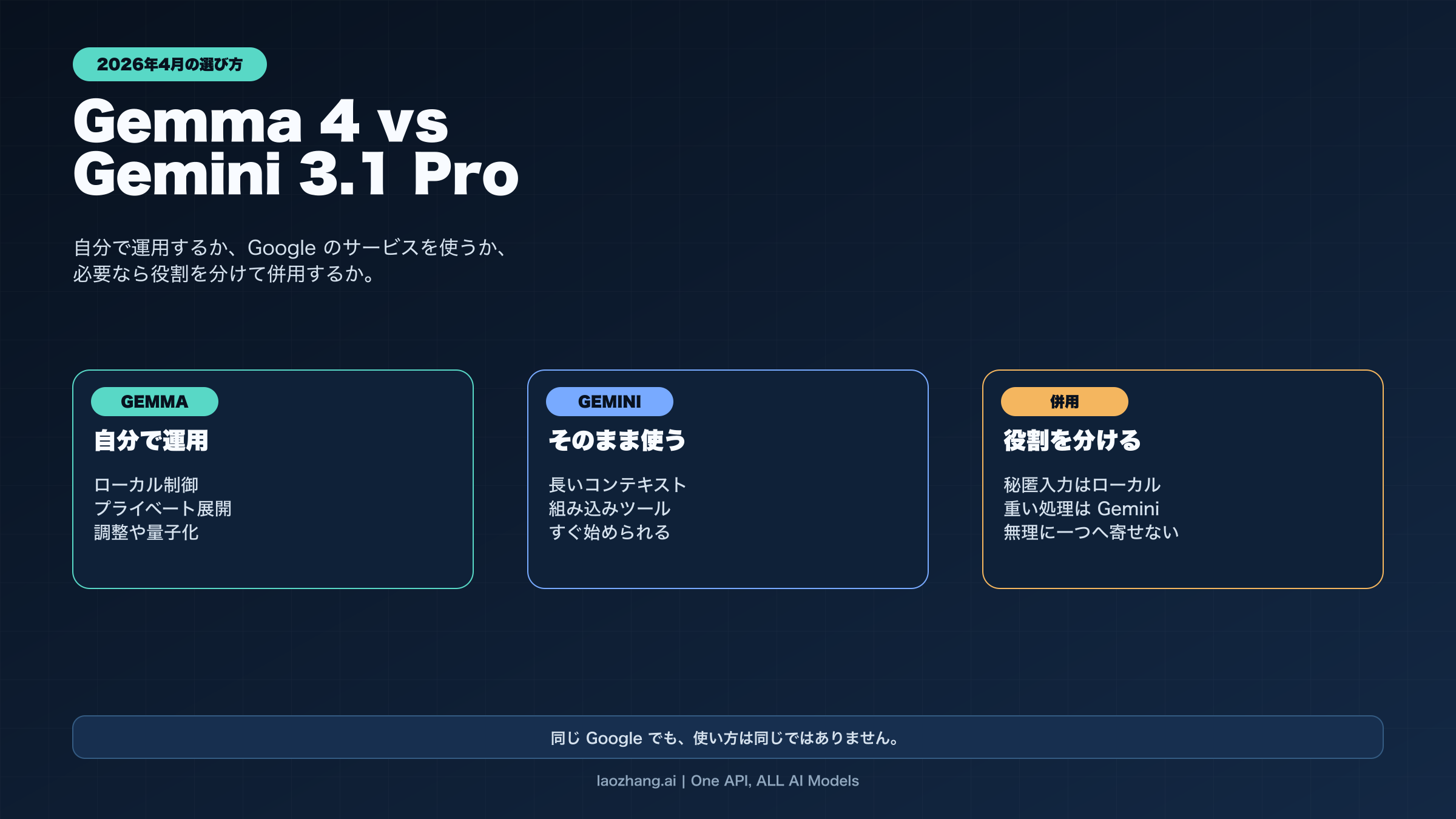 | 一つの作業の中にローカルで閉じたい段階とクラウドに任せたい段階が両方ある | 併用 | 機密や軽量処理は Gemma、長文推論や重い処理だけ Gemini に分けられる | 本当に二種類の制約に分かれるときだけ価値が出る |