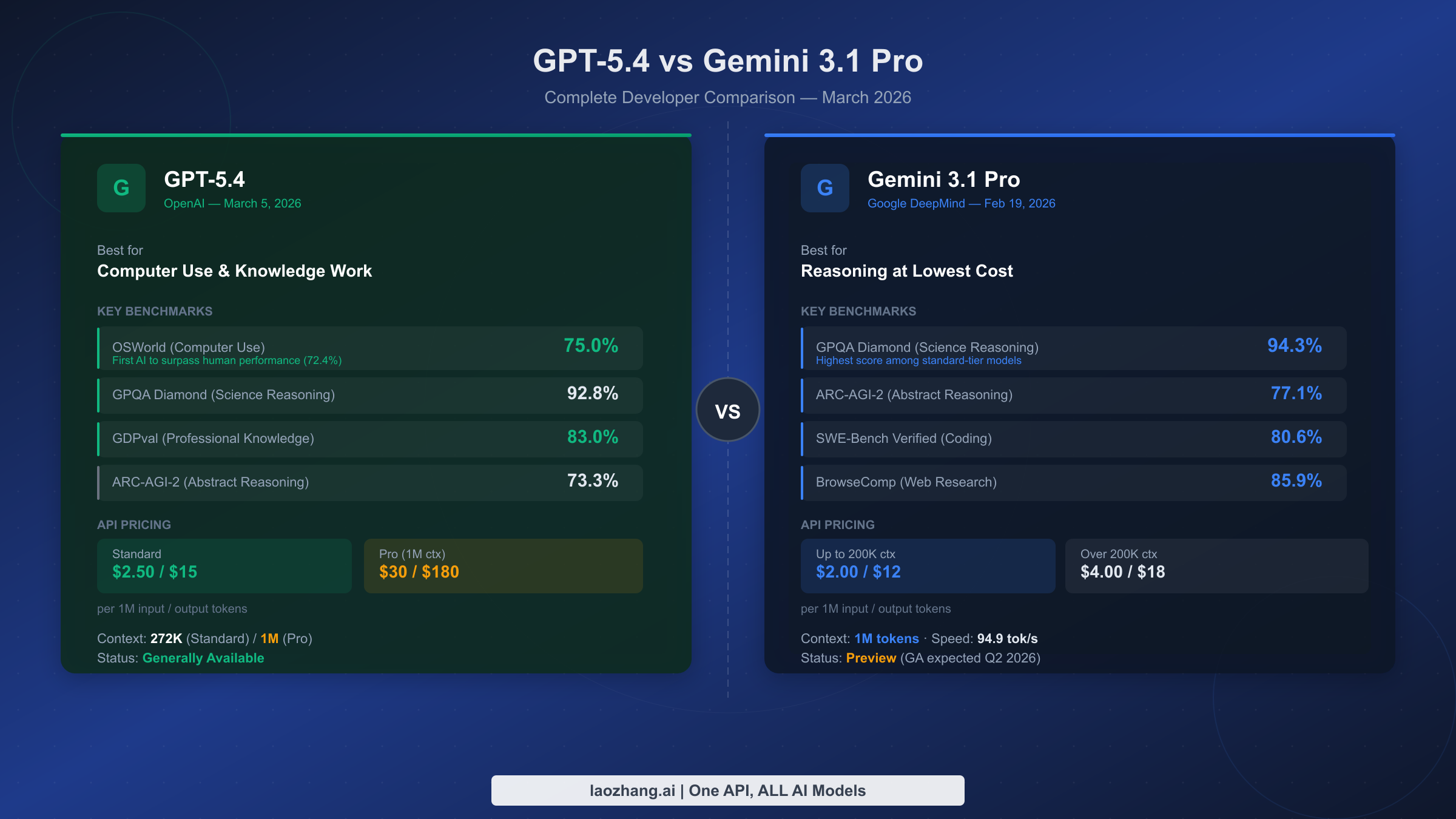 GPT-5.4 Pro で同じ中規模SaaSトラフィックを処理すると$20,250/月——対して Gemini 3.1 Pro の$1,350/月。この月$18,900の差は、非常に長いドキュメントや大規模なコードベースを処理するチームにとって実質的な選択ポイントです。両方のモデルを異なるワークロードに使用するチームには、laozhang.ai のような統合APIサービスで単一APIキーの下で GPT-5.4 と Gemini 3.1 Pro を統合することで、運用コストを削減できます。