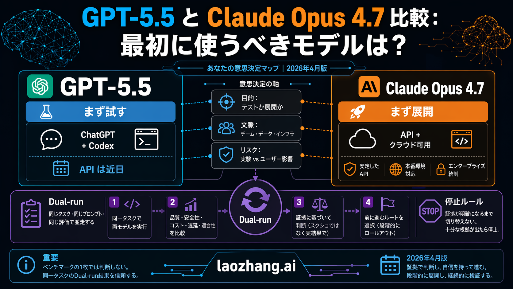 repo edits、terminal tasks、OpenAI-native coding が主なら、GPT-5.5 が first seat です。production agent、explicit API budget、cloud routing、long context、controlled rollout が主なら、Opus 4.7 が first seat です。