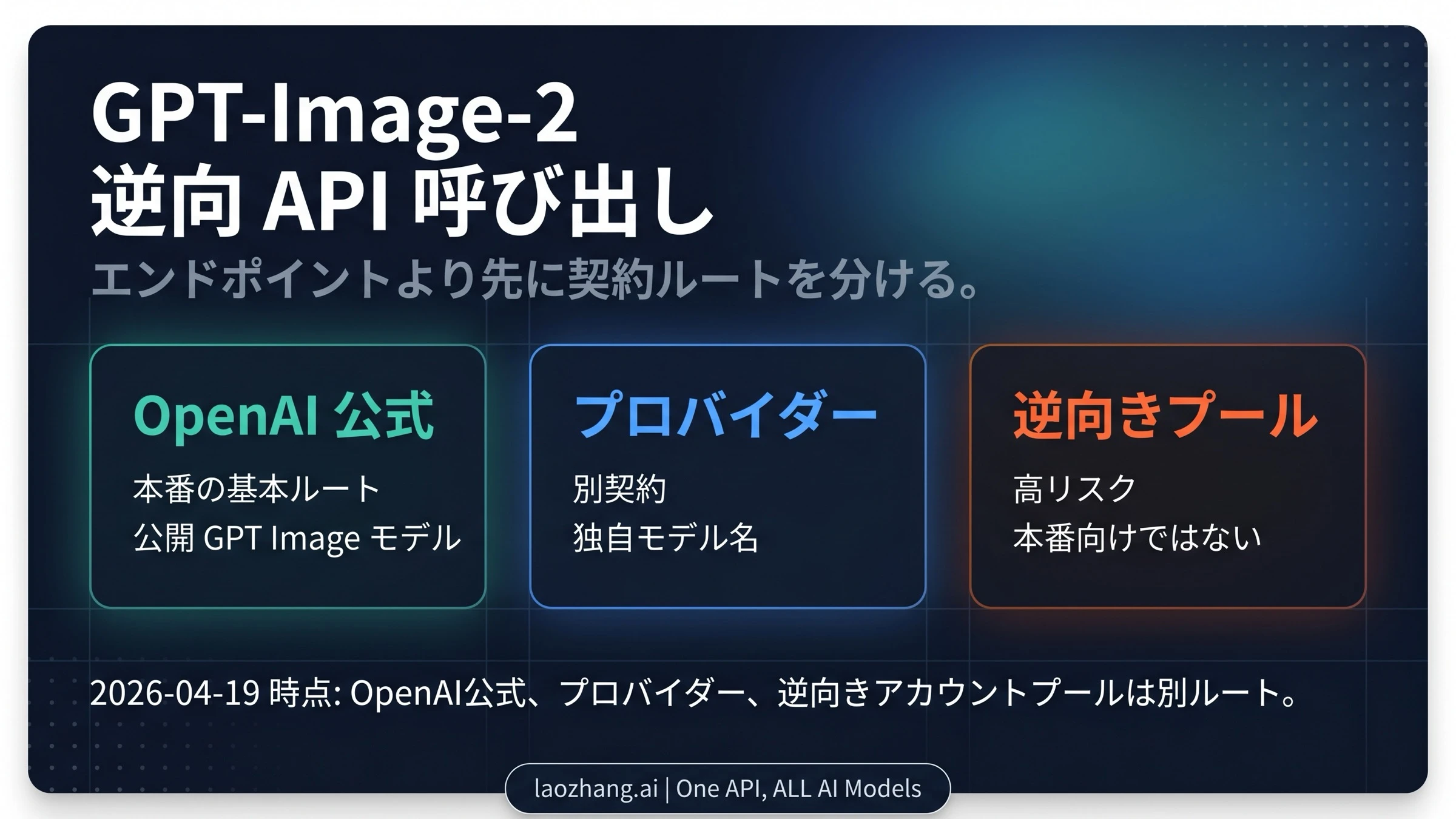 laozhang.ai は API gateway や互換呼び出しの選択肢になり得ます。OpenAI が gpt-image-2 を公開 API モデルとして出した証明にはなりません。