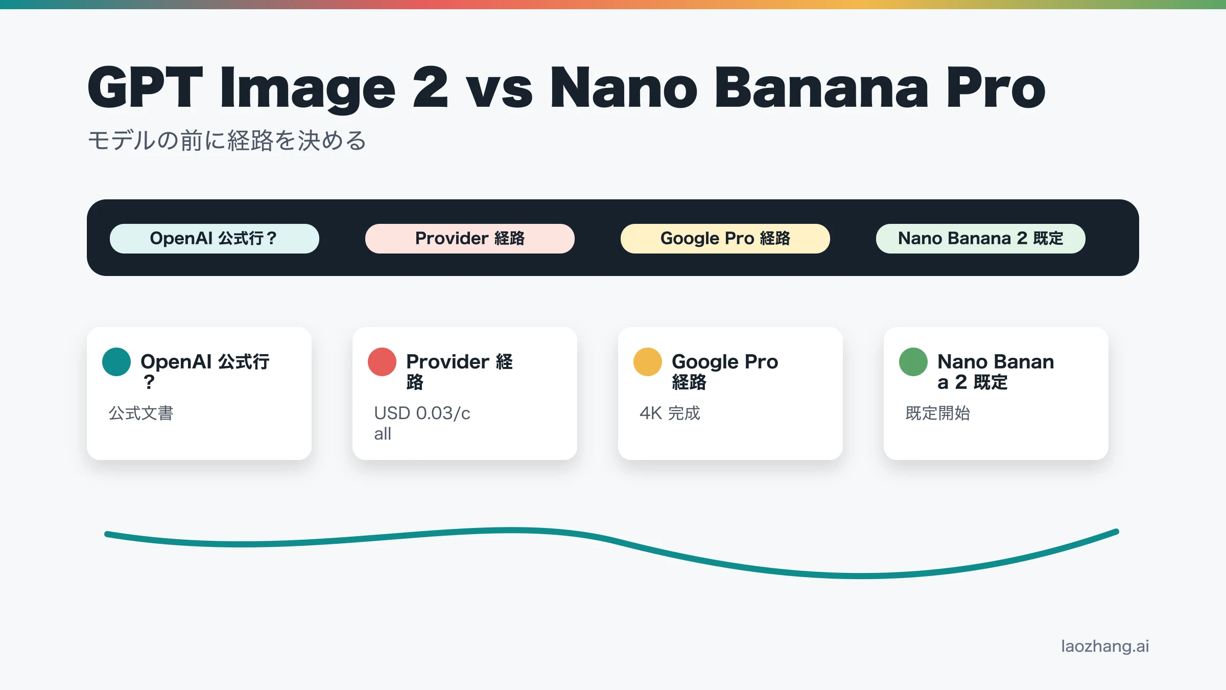 公式OpenAIが必須なら公開済みGPT Image行から始めます。OpenAI互換APIをプロバイダー契約で試せるなら、laozhang.ai gpt-image-2 を小さく検証します。Google APIの通常作業はNano Banana 2から始めます。可読テキスト、構造、商品品質、キャラクター一貫性、4K、レビューコストが重いときだけNano Banana Proへ上げます。