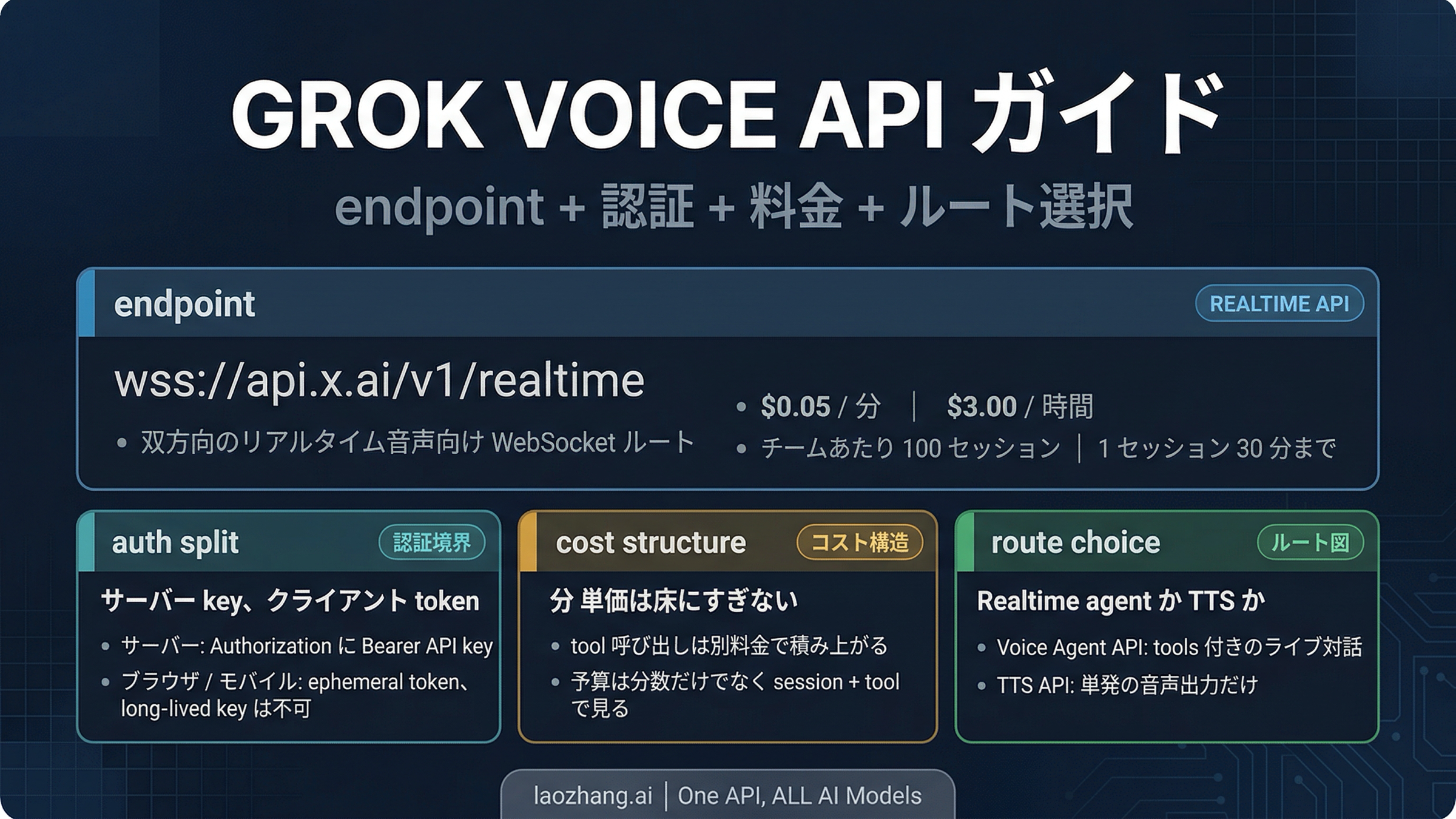 xAI の realtime voice を開発者として使いたいなら、まず押さえるべき公開入口は Grok Voice Agent API で、接続先は wss://api.x.ai/v1/realtime です。2026年4月6日 時点の公開 self-serve 情報では、$0.05 / 分、チームあたり 100 同時セッション、1 セッション 30 分までという条件が確認できます。最初に一緒に固定しておきたいのは認証の持ち方です。long-lived API key は trusted backend にだけ置き、browser や mobile は ephemeral token でつなぐ。さらに、必要なのが live conversation ではなく、最後に一度だけ音声を返すことなら、realtime loop から始めるより Text to Speech API を選ぶほうが自然です。