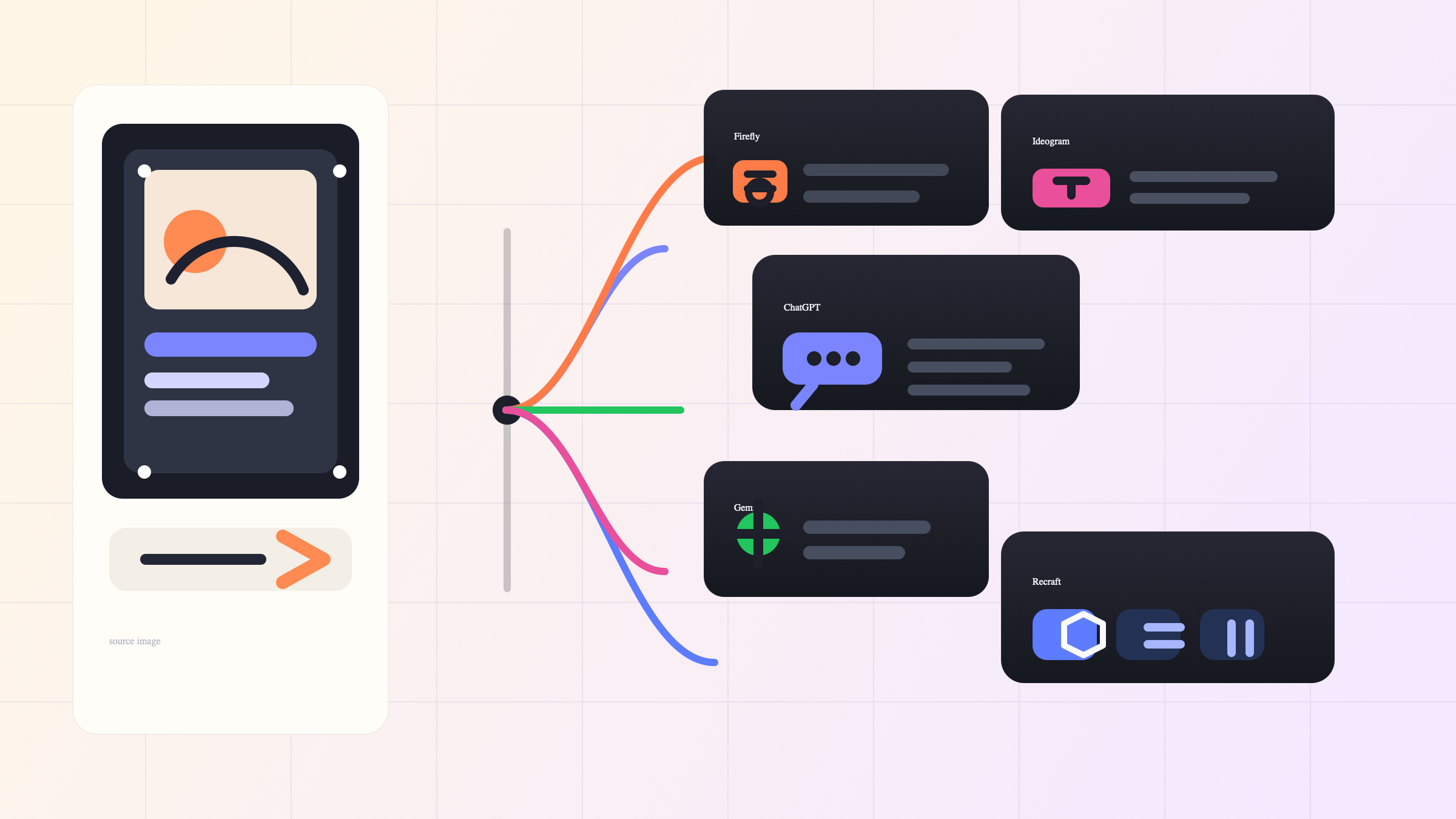 第一の見落とされやすい tradeoff は conversation vs control です。ChatGPT は話しかけやすさで勝ちます。Firefly は元画像保全で勝ちます。Recraft は canvas と references で勝ちます。これは見た目の違いではなく、使い心地を決める本質的な差です。