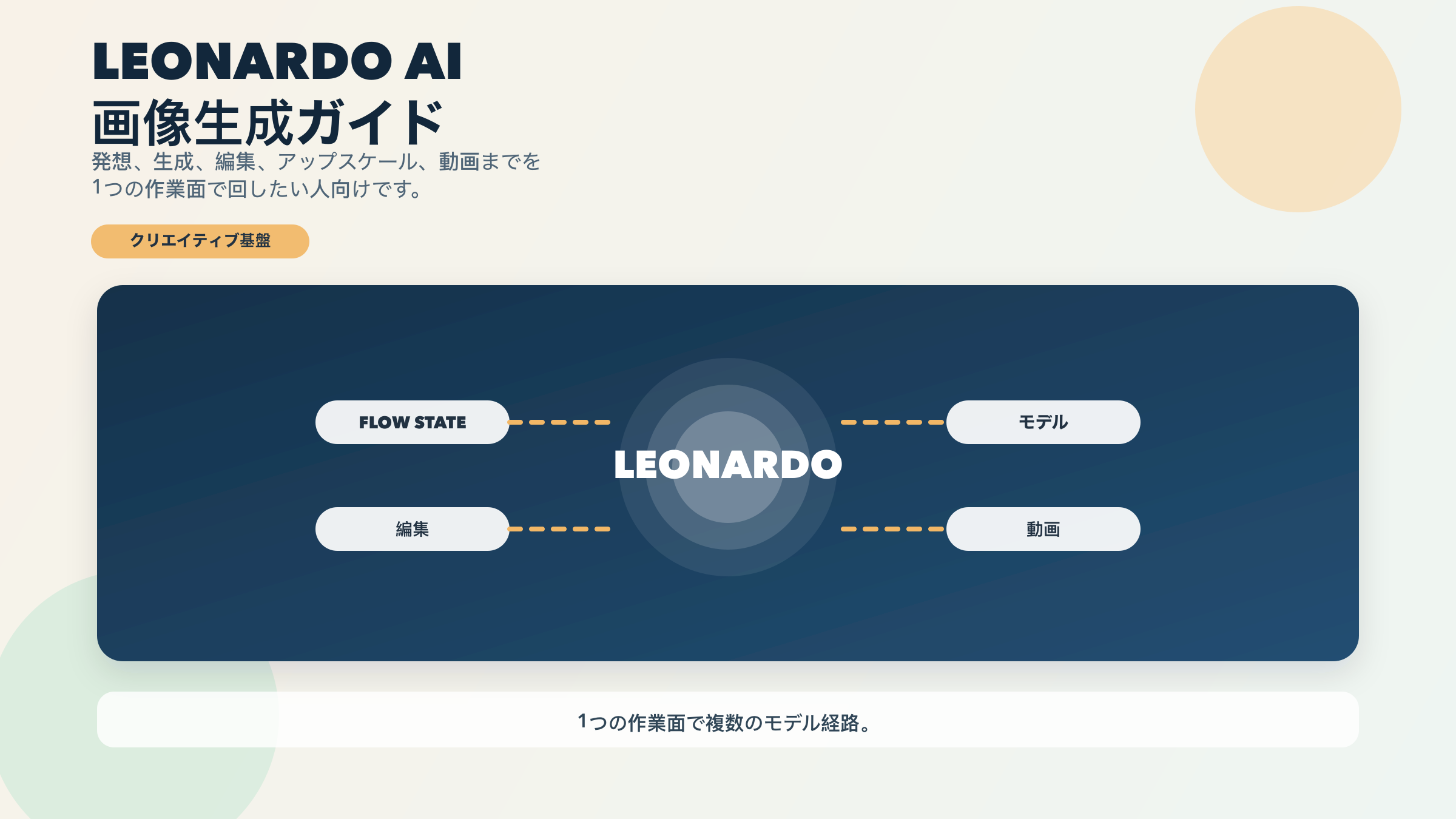だからLeonardoを「画質の良い画像生成サービス」とだけ説明するのは雑すぎます。もっと正確には、Leonardoはideation、generation、editing、motionを1つの場所で回したい人向けのcreative workspace です。