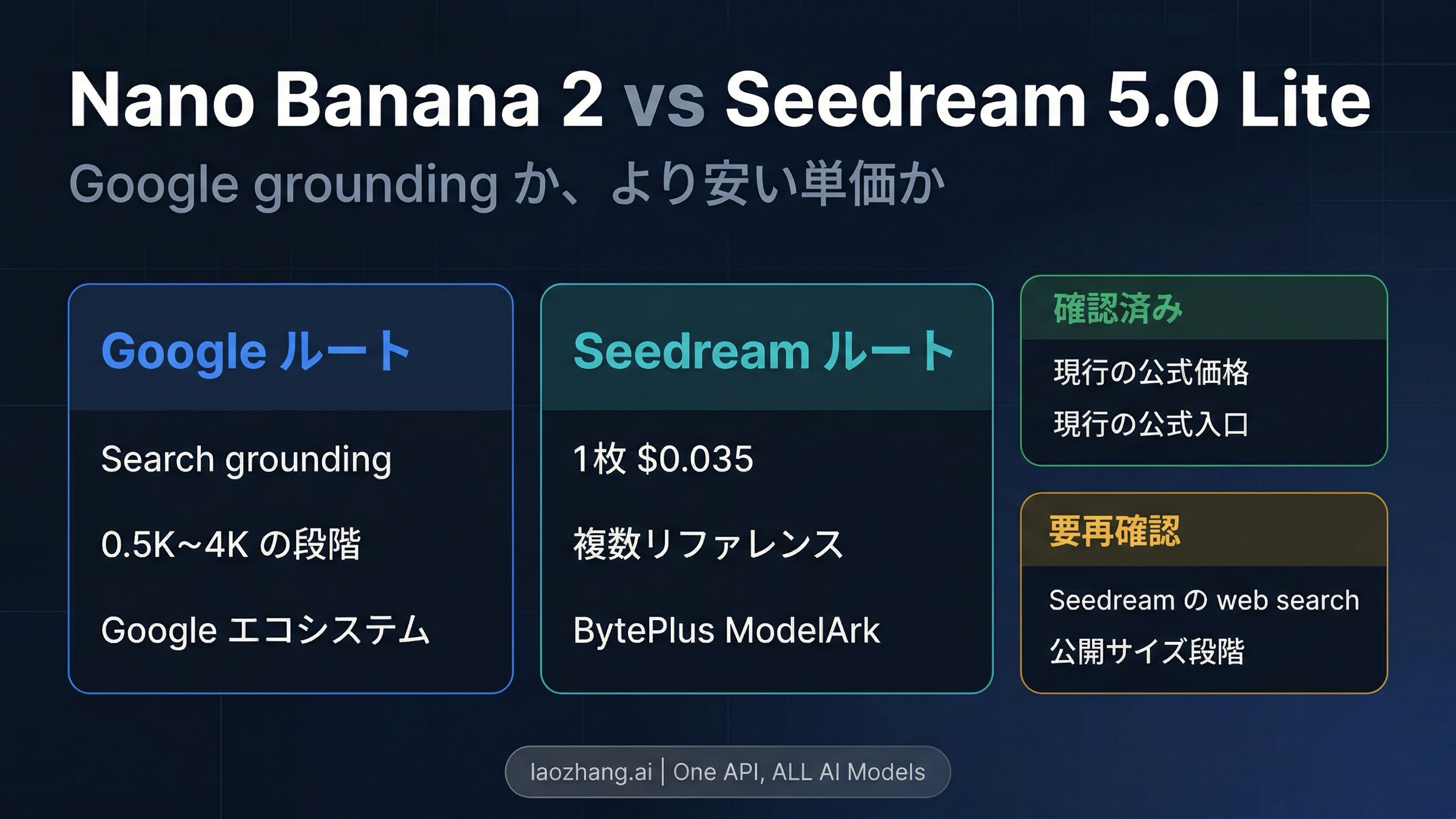 2026年4月3日時点で、Google の現行 Gemini ドキュメントは gemini-3.1-flash-image-preview について Search grounding 対応を明示し、サイズ別の価格も公開しています。一方、BytePlus の現行 Seedream ページは Seedream 5.0 Lite を \$0.035/枚 と示し、ModelArk 上でテキストから画像、画像から画像、複数の参照画像、バッチ生成を公開しています。もし Nano Banana 2 という通称からここに来たなら、Google 側で実際に見ているのは Gemini 3.1 Flash Image Preview です。ここから先は、現在の公式ルート同士で比べるのがいちばん実用的です。