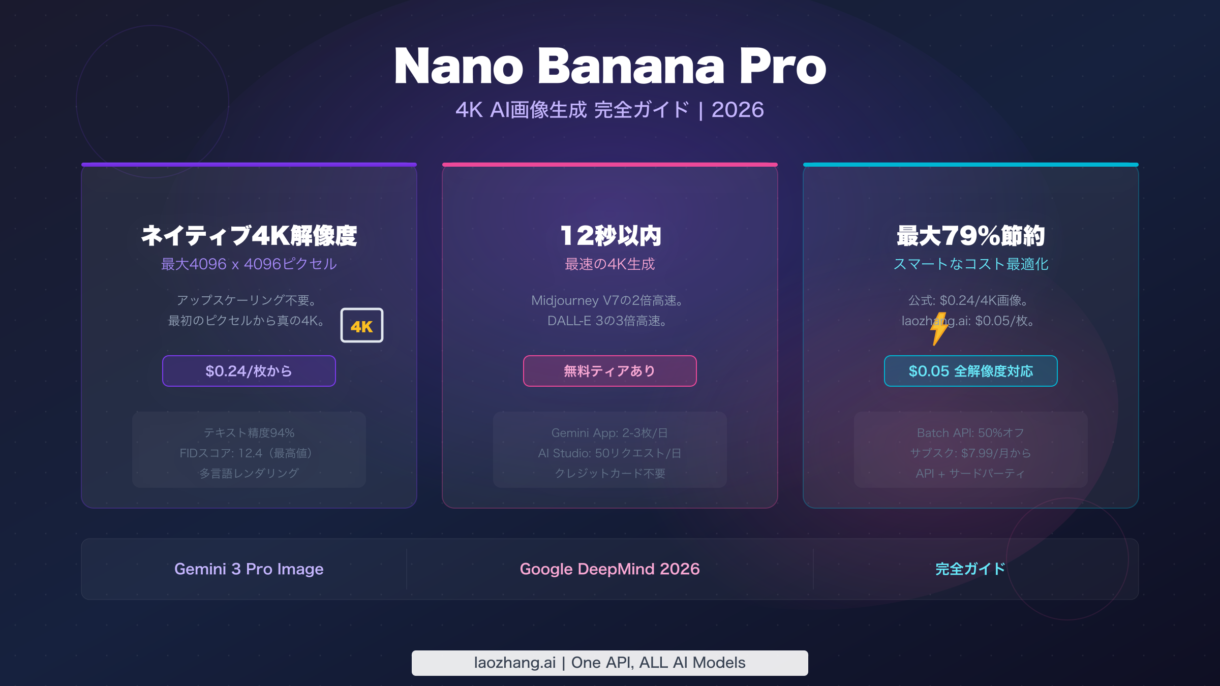 Nano Banana Pro(Gemini 3 Pro Image)は最大4096x4096ピクセルのネイティブ4K画像を12秒以内に生成し、テキスト精度94%以上を実現します。公式API料金は2K画像1枚あたり$0.134、4K画像1枚あたり$0.24です(2026年3月時点)。laozhang.aiなどのサードパーティプロバイダーでは、全解像度$0.05/枚で利用でき、最大79%の節約が可能です。無料アクセスはGoogle AI Studio(50リクエスト/日)とGemini App(1MPで2〜3枚/日)から利用できます。